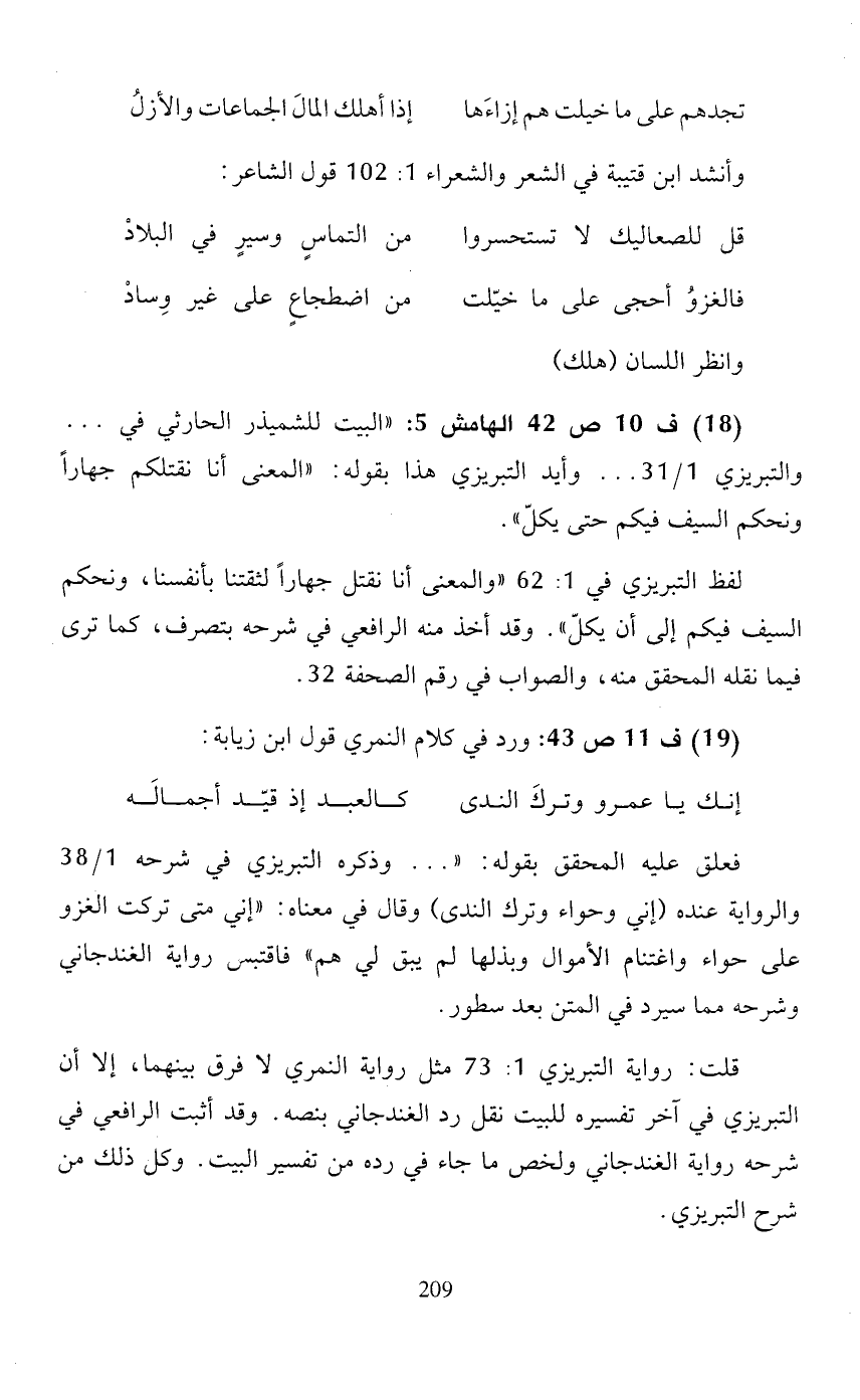 (18) ف 10 ص 42 الهامش 5: "البيت للشميذر الحارثي في ... والتبريزي 1/ 31 ..... وأيد التبريزي هذا بقوله: "المعنى أنا نقتلكم جهارًا ونحكم السيف فيكم حتى يكلّ".