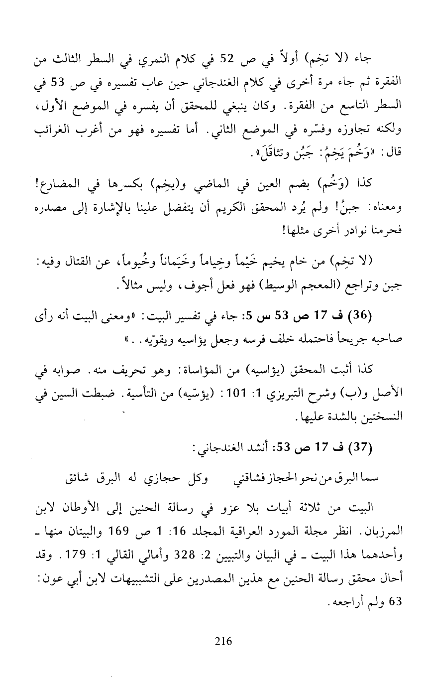 (36) ف 17 ص 53 س 5: جاء في تفسير البيت: "ومعنى البيت أنه رأى صاحبه جريحًا فاحتمله خلف فرسه وجعل يؤاسيه ويقوّيه ... "