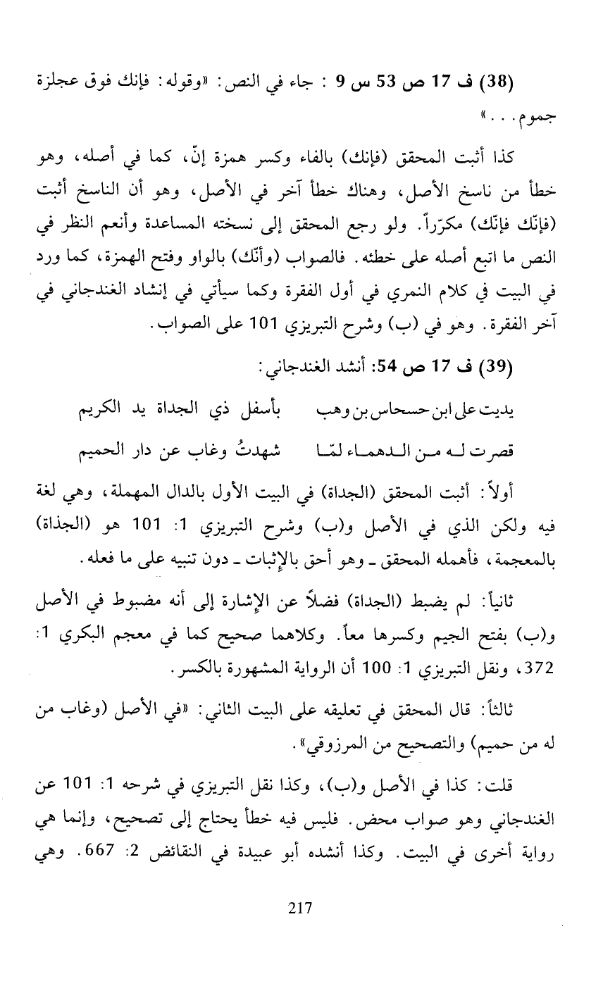 أولاً: أثبت المحقق (الجداة) في البيت الأول بالدال المهملة، وهي لغة فيه ولكن الذي في الأصل و (ب) وشرح التبريزي 1: 101 هو (الجداة) بالمعجمة، فأهمله المحقق -وهو أحق بالإثبات- دون تنبيه على ما فعله.