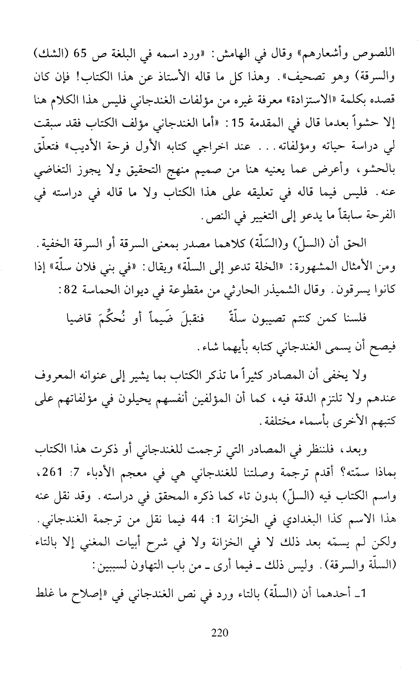 وبعد، فلننظر في المصادر التي ترجمت للغندجاني أو ذكرت هذا الكتاب بماذا سمّته؟ أقدم ترجمة وصلتنا للغندجاني هي في معجم الأدباء 7: 261، واسم الكتاب فيه (السلّ) بدون تاء كما ذكره المحقق في دراسته. وقد نقل عنه هذا الاسم كذا بالغدادي في الخزانة 1: 44 فيما نقل من ترجمة الغندجاني. ولكن لم يسمّه بعد ذلك لا في الخزانة ولا في شرح أبيات المغني إلا بالتاء (السلّة والسرقة). وليس ذلك -فيما أرى- من باب التهاون لسببين: