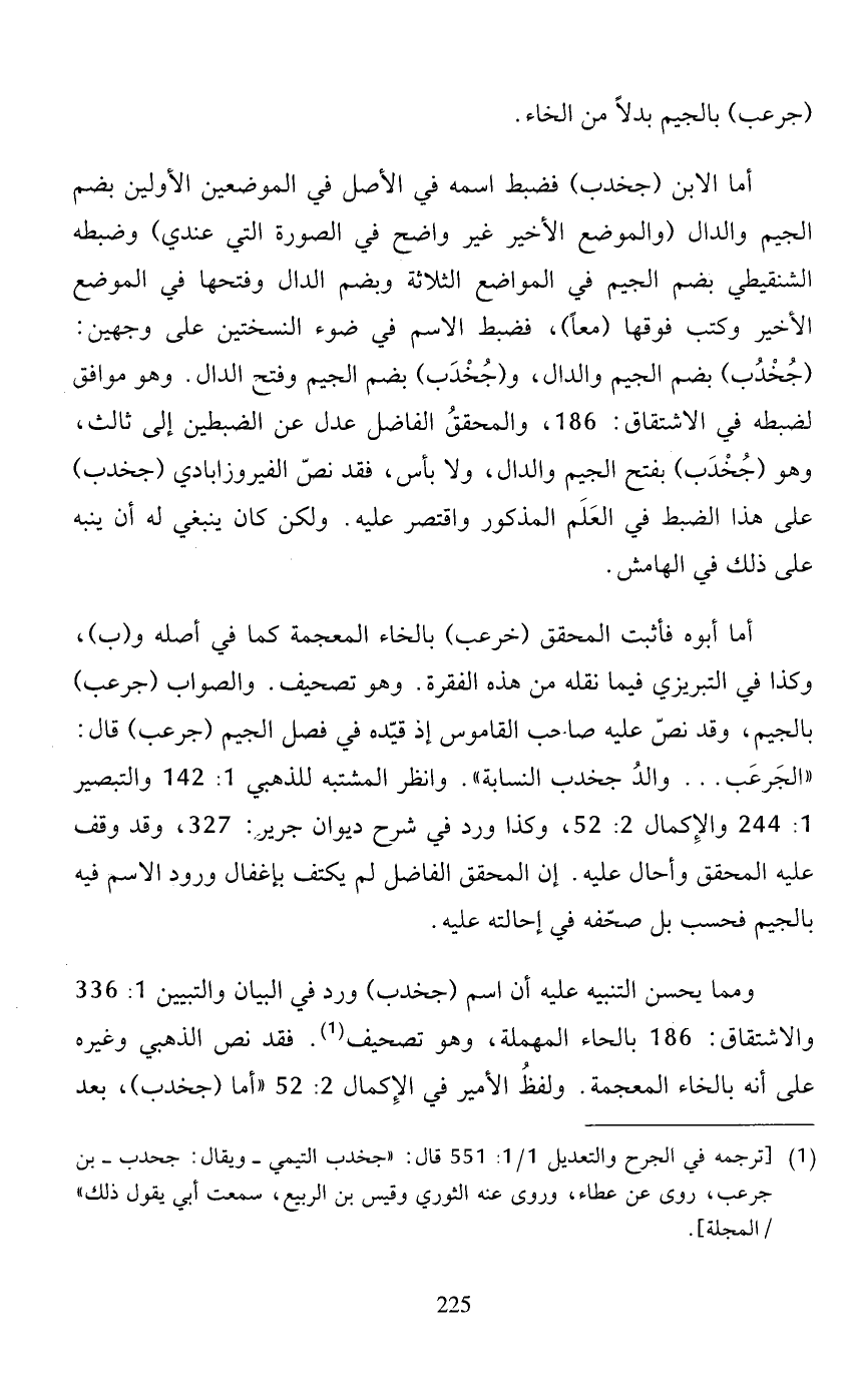 أما الابن (جخدب) فضبط اسمه في الأصل في الموضعين الأولين بضم الجيم والدال (والموضع الأخير غير واضح في الصورة التي عندي) وضبطه الشنقيطي بضم الجيم في المواضع الثلاثة وبضم الدال وفتحها في الموضع الأخير وكتب فوقها (معًا)، فضبط الاسم في ضوء النسختين على وجهين: _جخدب) بضم الجيم والدال، و (جخدب) بضم الجيم وفتح الدال. وهو موافق لضبطه في الاشتقاق: 186، والمحقق الفاضل عدل عن الضبطين إلى ثالث، وهو (جخدب) بفتح الجيم والدال، ولا بأس، فقط نصّ الفيروزابادي (جخدب) على هذا الضبط في العلم المذكور واقتصر عليه. ولكن كان ينبغي له أن ينبه على ذلك في الهامش.