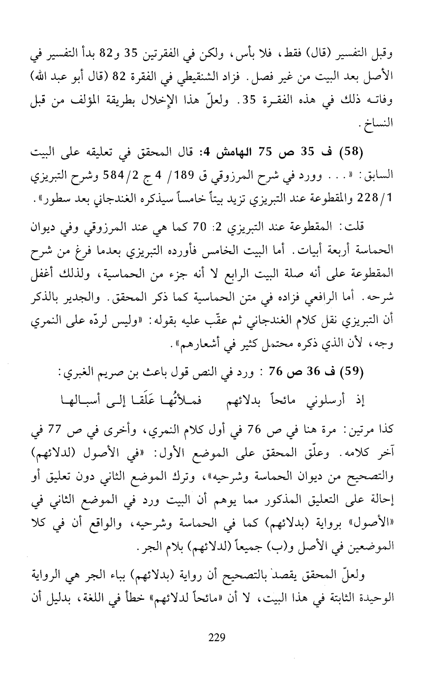 (58) ف 35 ص 75 الهامش 4: قال المحقق في تعليقه على البيت السابق: " ... وورد في شرح المرزوقي ق 189/ 4 ج 2/ 584 وشرح التبريزي 1/ 228 والمقطوعة عند التبريزي تزيد بيتًا خامسًا سيذكره الغندجاني بعد سطور".