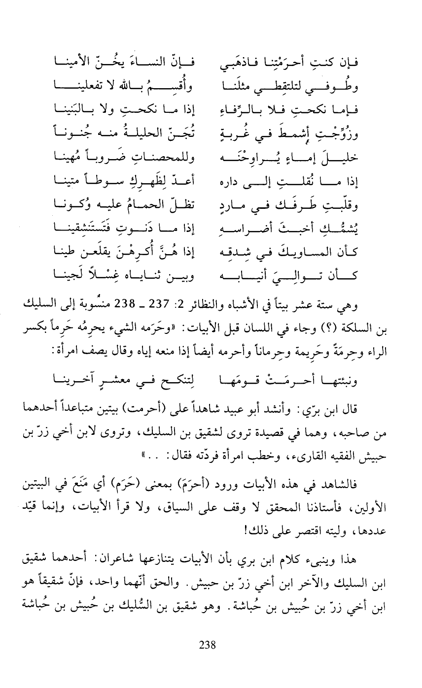 وهي ستة عشر بيتًا في الأشباه والنظائر 2: 237 - 238 منسوبة إلى السليك بن السلكة (؟ ) وجاء في اللسان قبل الأبيات: "وحرمه الشيء يحرمه حرمًا بكسر الراء وحرمةً وحريمة وحرمانًا وأحرمه أيضًا إذا منعه إياه وقال يصف امرأة: