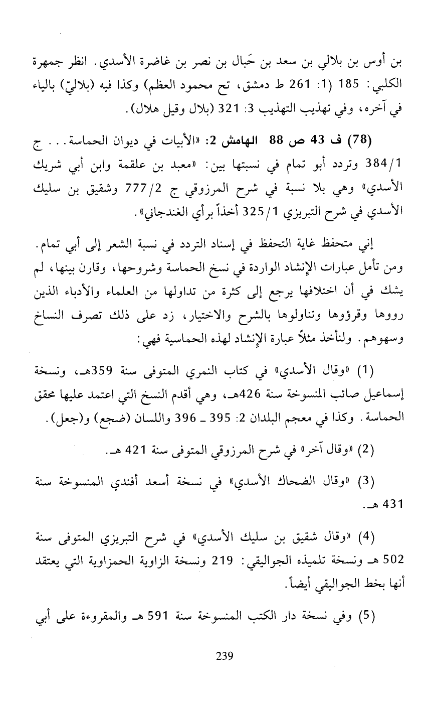 (78) ف 43 ص 88 الهامش 2: "الأبيات في ديوان الحماسة ... ج 1/ 384 وتررد أبو تمام في نسبتها بين: "معبد بن علقمة وابن أبي شريك الأسدي" وهي بلا نسبة في شرح المرزوقي ج 2/ 777 وشقيق بن سليك الأسدي في شرح التبريزي 1/ 325 أخذًا برأي الغندجاني".