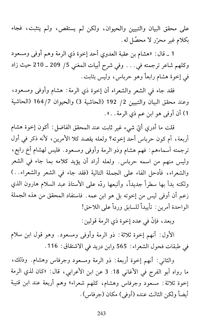 قلت ما أدري أيّ شيء غير ثابت عند المحقق الفاضل: أكون إخوة هشام أربعة، أم كون حرباس أحد إخواته؟ ولعله يقصد كلا الأمرين، لأنه ذكر في أول ترجمته أسماءهم: فهم هشام وذو الرمة وأوفى ومسعود. فليس لهشام أخ رابع، وليس منهم من اسمه حرباس. ولعله أراد أن يؤيد كلامه بما جاء في الشعر والشعراء، فأدحل الفاء على الجملة التالية (فقد جاء في الشعر والشعراء ... ) ولكنه بدأ بها سطرًا جديدًا، وأتبعها ردّه على الأستاذ عبد السلام هارون الذي زعم أن أوفى ليس من إخوته بل هو ابن عمه. فاستفاد المحقق من هذه الجملة الواحدة أمرين: تأييدًا للسابق وردًا على اللاحق!