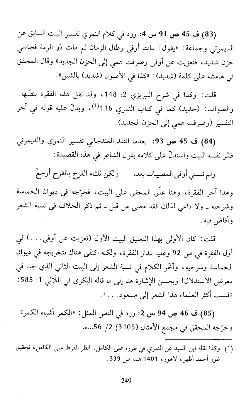 (83) ف 45 ص 91 س 4: ورد في كلام النمري تفسير البيت السابق عن الديمرتي وجماعة: "يقول: مات أوفى وطال الزمان ثم مات ذو الرمة فجاءني حزن شديد، فتعزيت عن أوفى وصرفت همي إلى الحزن الجديد" وقال المحقق في هامشه على كلمة (شديد): "كذا في الأصول (شديد) بالشين".