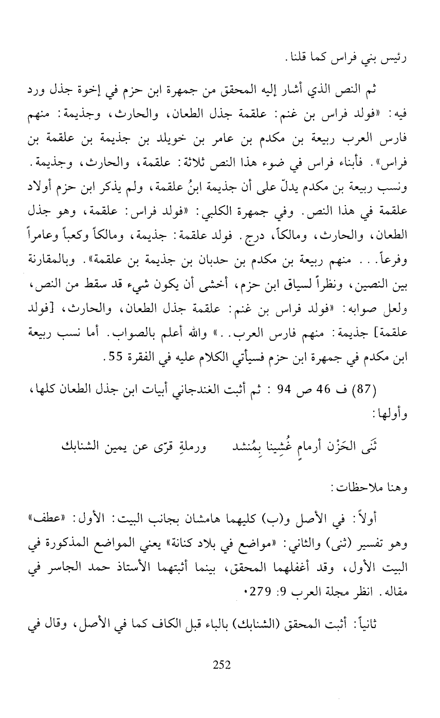 ثم النص الذي أشار إليه المحقق من جمهرة ابن حزم في إخوة جذل ورد فيه: "فولد فراس بن غنم: علقمة جذل الطعان، والحارث، وجذيمة: منهم فارس العرب ربيعة بن مكدم بن عامر بن خويلد بن جذيمة بن علقمة بن فراس". فأبناء فراس في ضوء هذا النص ثلاثة: علقمة، والحارث، وجذيمة. ونسب ربيعة بن مكدم يدلّ على أن جذيمة ابن علقمة، ولم يذكر ابن حزم أولاد علقمة في هذا النص. وفي جمهرة الكلبي: "فولد فراس: علقمة، وهو جذل الطعان، والحارث، ومالكًا، درج. فولد علقمة: جذيمة، ومالكًا وكعبًا وعامرًا وفرعًا ... منهم ربيعة بن مكدم بن حدبان بن جذيمة بن علقمة". وبالمقارنة بين النصين، ونظرًا لسياق ابن حزم، أخشى أن يكون شيء قد سقط من النص، ولعل صوابه: "فولد فراس بن غنم: علقمة جذل الطعان، والحارث، [فولد علقمة] جذيمة: منهم فارس العرب ... " والله أعلم بالصواب. أما نسب ربيعة ابن مكدم في جمهرة ابن حزم فسيأتي الكلام عليه في الفقرة 55.
