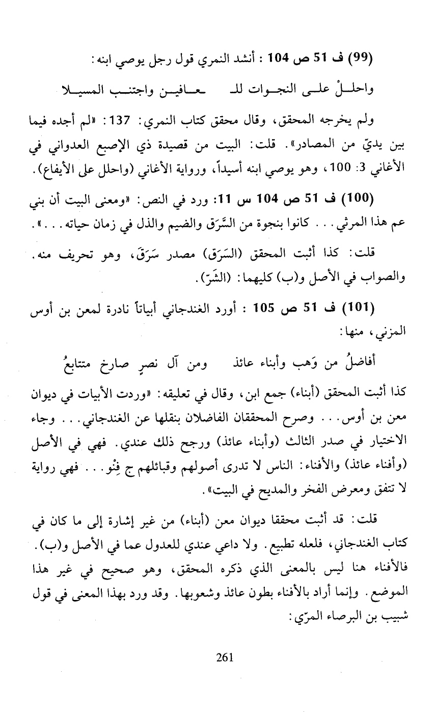(100) ف 51 ص 104 س 11: ورد في النص: "ومعنى البيت أن بني عم هذا المرثي ... كانوا بنجوة من السَّرق والضيم والذل في زمان حياته .... ".