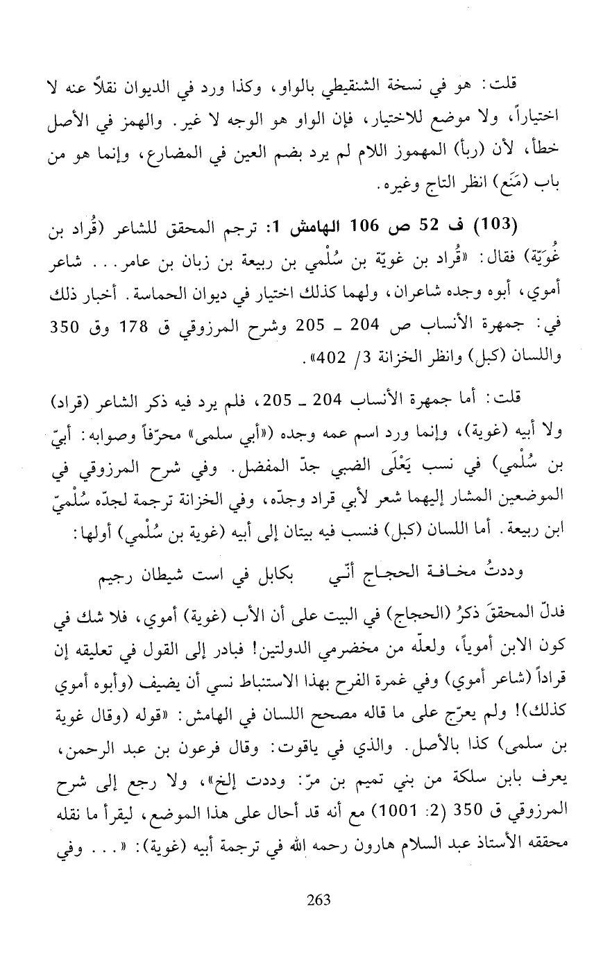 (103) ف 52 ص 106 الهامش 1: ترجم المحقق للشاعر (قراد بن غويّة) فقال: "قراد بن غويّة بن سلمي بن ربيعة بن زبان بن عامر .... شاعر أموي، أبوه وجده شاعران، ولهما كذلك اختيار في ديوان الحماسة. أخبار ذلك في: جمهرة الأنساب ص 204 - 205 وشرح المرزوقي ق 178 وق 350 واللسان (كبل) وانظر الخزانة 3/ 402".