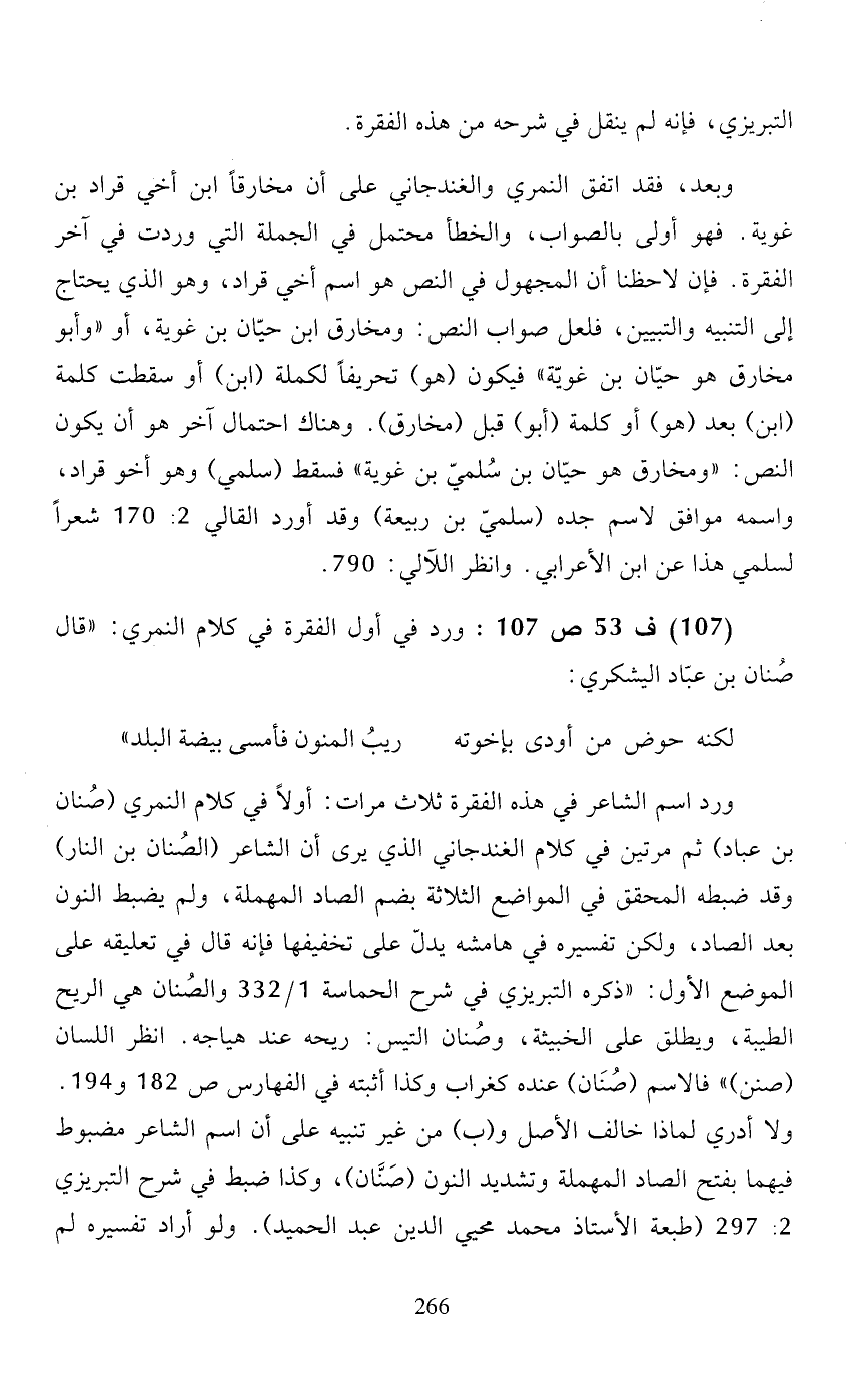 (107) ف 53 ص 107: ورد في أول الفقرة في كلام النمري: "قال صنان بن عبّاد اليشكري: