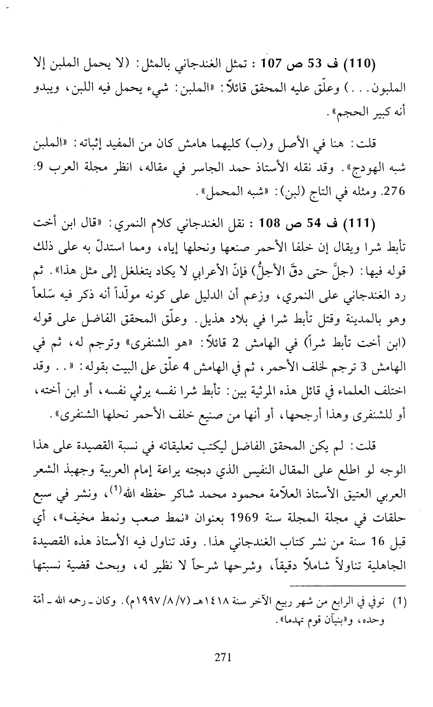 قلت: لم يكن المحقق الفاضل ليكتب تعليقاته في نسبة القصيدة على هذا الوجه لو اطلع على المقال النفيس الذي دبجته يراعة إمام العربية وجهبذ الشعر العربي العتيق الأستاذ العلاّمة محمود محمد شاكر حفظه الله (1)، ونشر في سبع حلقات في مجلة المجلة سنة 1969 بعنوان (نمط صعب ونمط مخيف)، أي قبل 16 سنة من نشر كتاب الغندجاني هذا. وقد تناول فيه الأستاذ هذه القصيدة الجاهلية تناولاً شاملًا دقيقًا، وشرحها شرحًا لا نظير له، وبحث قضية نسبتها