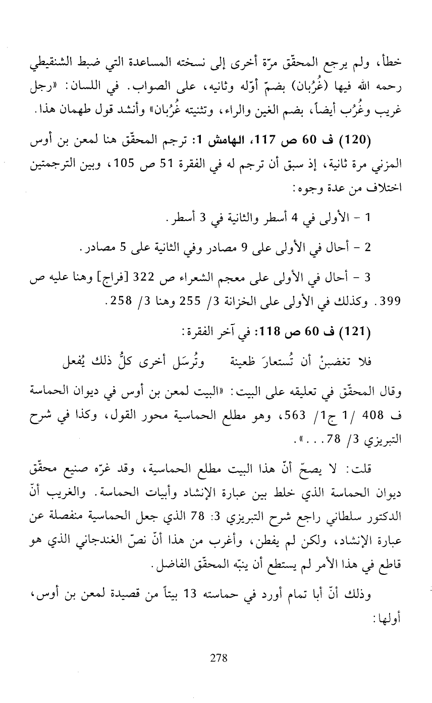 قلت: لا يصحّ أنّ هذا البيت مطلع الحماسية، وقد عزّة صنيع محقّق ديوان الحماسة الذي خلط بين عبارة الأنشاد وأبيات الحماسة. والغريب أنّ الدكتور سلطاني راجع شرح البريزي 3: 78 الذي جعل الحماسية منفصلة عن عبارة الإنشاد، ولكن لم يفطن، وأغرب من هذا أنّ نصّ الغندجاني الذي هو قاطع في هذا الأمر لم يستطع أن ينبّه المحقّق الفاضل.