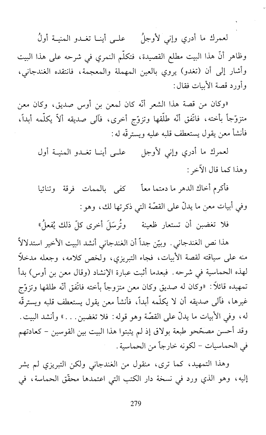 هذا نص الغندجاني. وبيّن جدًا أن الغندجاني أنشد البيت الأخير استدلالاً منه على سياقته لقصة الأبيات، فجاء التبريزي، ولخص كلامه، وجعله مدخلًا لهذا الحماسية في شرحه. فبعدما أثبت عبارة الإنشاد (وقال معن بن أوس) بدأ تمهيده قائلاً: (وكان له صديق وكان معن متزوجًا بأخته فاتّفق أنّه طلقها وتزوّج غيرها، فآلى صديقه أن لا يكلّمه أبداً، فأنشأ معن يقول يستعطف قلبه ويسترقّه له، وفي الأبيات ما يدلّ على القصّة وهو قوله: فلا تغضبن ... ) وأنشد البيت. وقد أحسن مصحّحو طبعة بولاق إذ لم يثبتوا هذا البيت بين القوسين- كعادتهم في الحماسيات- لكونه خارجًا من الحماسية.