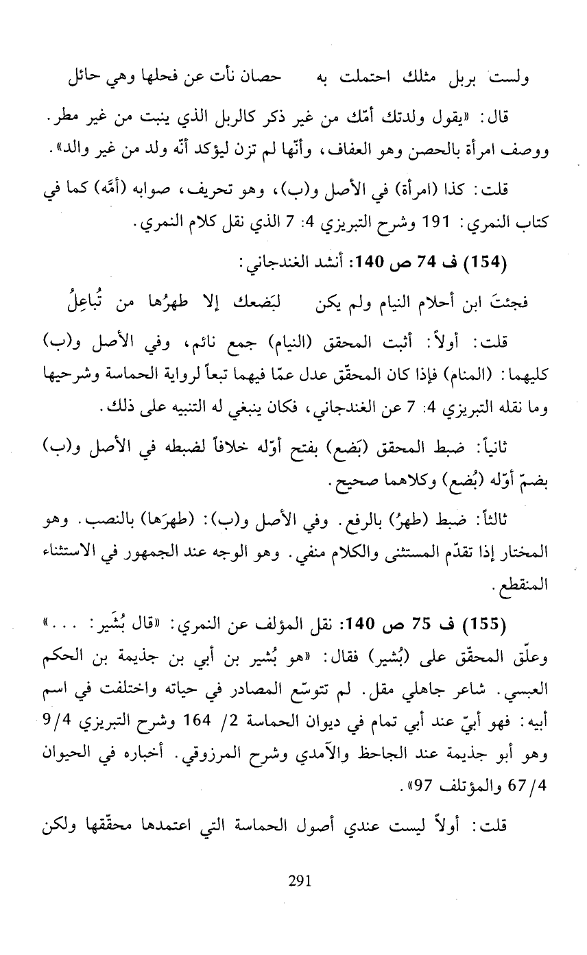 (155) ف 75 ص 140: نقل المؤلف عن النمري: "قال بشير: ... " وعلّق المحقّق على (بشير) فقال: "هو بشير بن أبي بن جذيمة بن الحكم العبسي. شاعر جاهلي مقل. لم تتوسّع المصادر في حياته واختلفت في اسم أبيه: فهو أبيّ تمام في ديوان الحماسة 2/ 164 وشرح التبريزي 4/ 9 وهو أبو جذيمة عند الجاحظ والآمدي وشرح المرزوقي. أخباره في الحيوان 4/ 67 والمؤتلف 97".