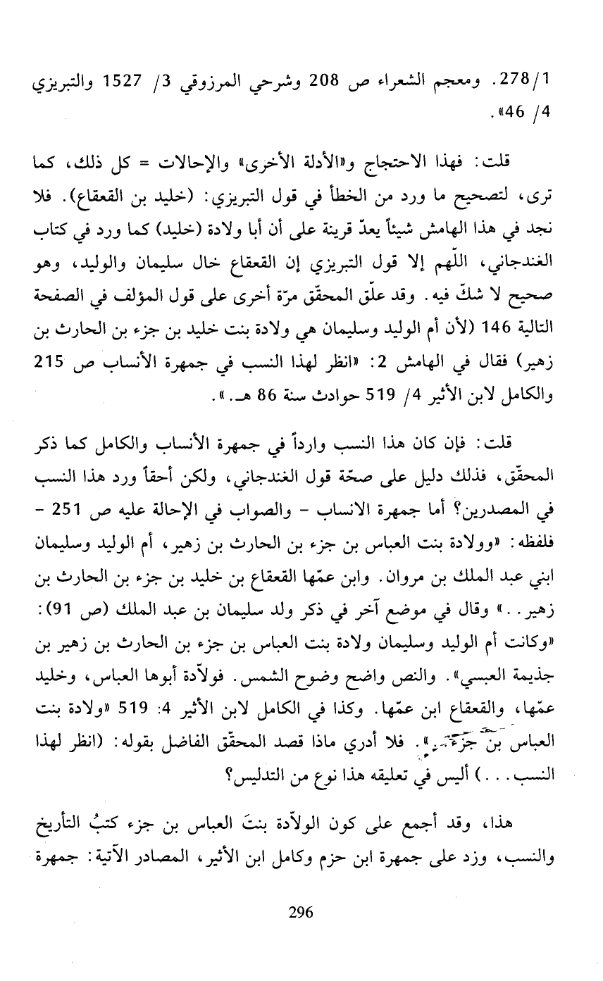 قلت: فإن كان هذا النسب واردًا في جمهرة الأنساب والكامل كما ذكر المحقّق، فذلك دليل على صحّة قول الغندجاني، ولكن أحقًا ورد هذا النسب في المصدرين؟ أما جمهرة الانساب -والصواب في الإحالة عليه ص 251 - فلفظه: "ولادة بنت العباس بن جزء بن الحارث بن زهير، بن جذيمة العبسي". والنص واضح وضح الشمس. فولّادة أبوها العباس، وخليد عمّها، والقعقاع ابن عمّها. وكذا في الكامل لابن الأثير 4: 519 "ولادة بنت العباس بن جزء .. ". فلا أدري ماذا قصد المحقّق الفاضل بقوله: (انظر لهذا النسب ... ) أليس في تعليقه هذا نوع من التدليس؟
