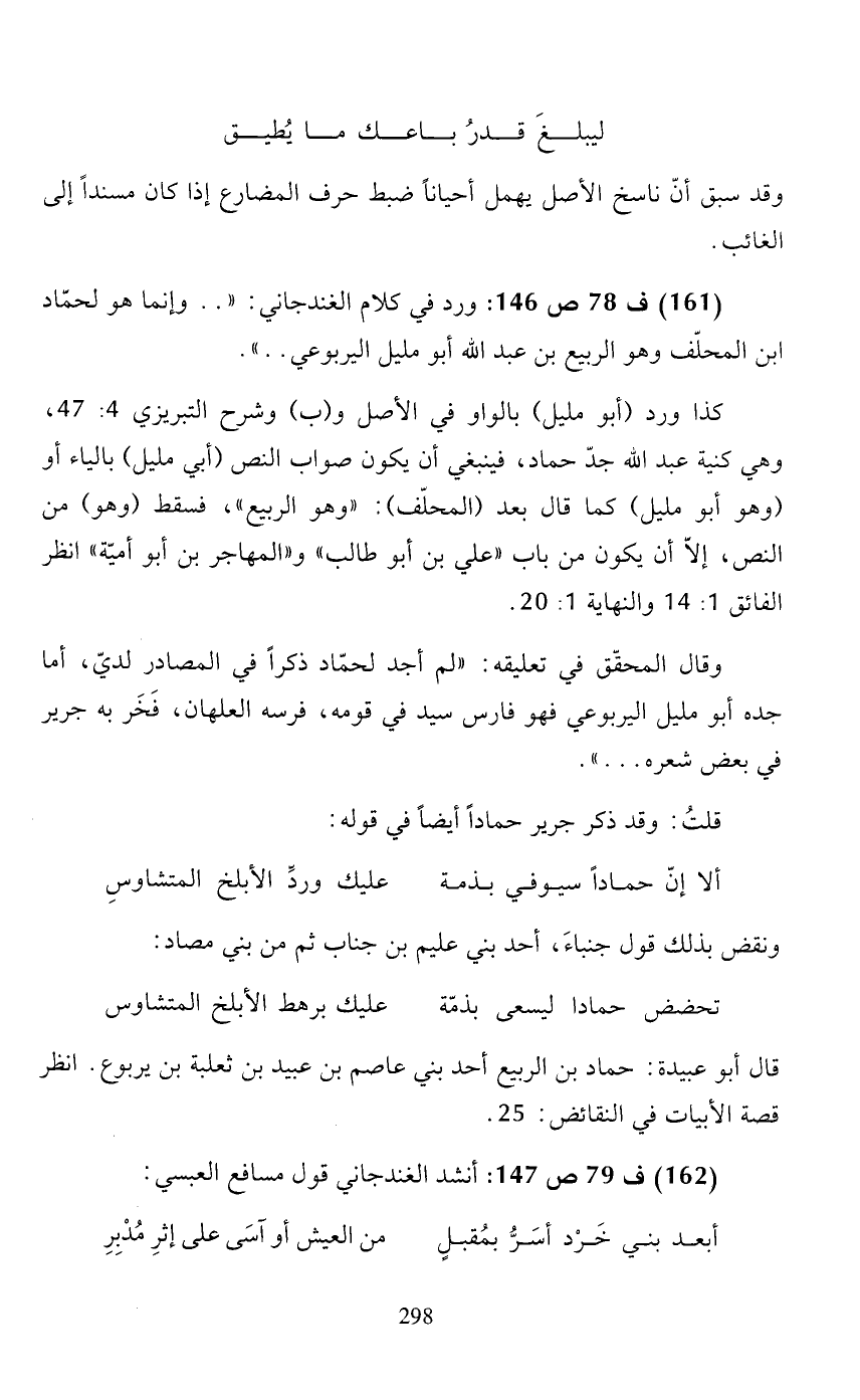 (161) ف 78 ص 146: ورد في كلام الغندجاني: " .. وإنما هو لحمّاد ابن المحلّف وهو الربيع بن عبد الله أبو مليل اليربوعي .. ".