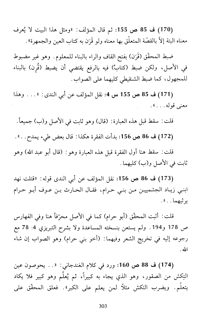 (170) ف 85 ص 155: ثم قال المؤلف: "ومثل هذا البيت لا يعرف معناه البتة إلاّ بالقصّة المتعلّق بها معناه ولو قرن به كتاب العين والجمهرة".