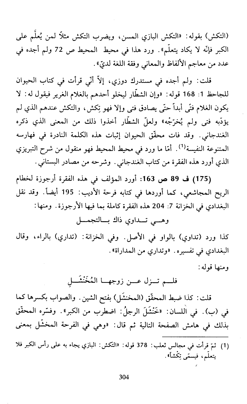 قلت: ولم أجده في مستدرك دوزي، إلاّ أنّي قرأن في كتاب الحيوان للجاحظ 1: 168 قوله: "وإن الشطّار ليخلو أحدهم بالغلام الغرير فيقول له: لا يكون الغلام فتًى أبدًا حتّى يصادق فتى وإلا فهو تكش، والتكش عندهم الذي لم يؤدّبه فتى ولم يخرّجه" ولعلّ الشطّار أخذوا ذلك من المعنى الذي ذكره الغندجاني. وقد فات محقّق الحيوان إثبات هذه الكلمة النادرة في فهارسه المتنوعة النفسية (1). أمّا ما ورد في محيط المحيط فهو منقول من شرح التبريزي الذي أورد هذه الفقرة من كتاب الغندجاني. وشرحه من مصادر البستاني.