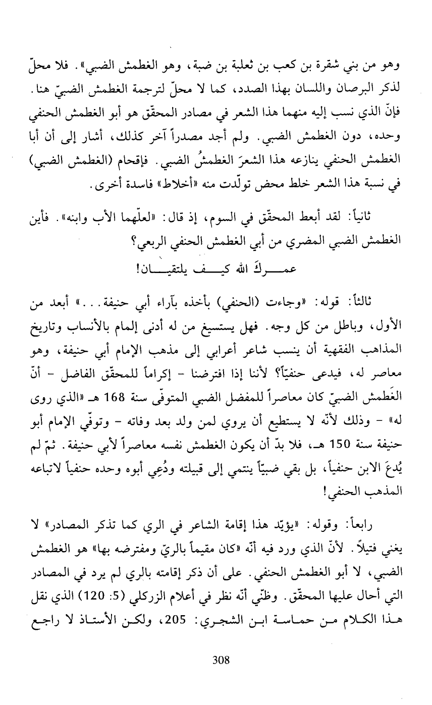 ثانيًا: قوله: "وجاءت (الحنفي) يأخذه بآراء أبي حنيفة .. " أبعد من الأول، وباطل من كل وجه. فهل يستسيغ من له أدنى إلمام بالأنساب وتاريخ المذاهب الفقهية أن ينسب شاعر أعرابي إلى مذهب الإمام أبي حنيفة، وهو معاصر له، فيدعى حنفيّاً؟ لأننا إذا افترضنا -إكرامًا للمحقّق الفاضل- أنّ الغطمش الضبّي كان معاصرًا للمفضل الضبي المتوفّى سنة 168 هـ "الذي روى له"-وذلك لأنّه لا يستطيع أن يروي لمن ولد بعد وفاته- وتوفّي الإمام أبو حنيفة سنة 150 هـ، فلابدّ أن يكون الغطمش نفسه معاصرًا لأبي حنيفة. ثمّ لم يدع الابن حنفيًا، بل بقي ضبيّاً ينتمي إلى قبيلته ودعي أبوه وحده حنفيًا لاتباعه المذهب الحنفي!