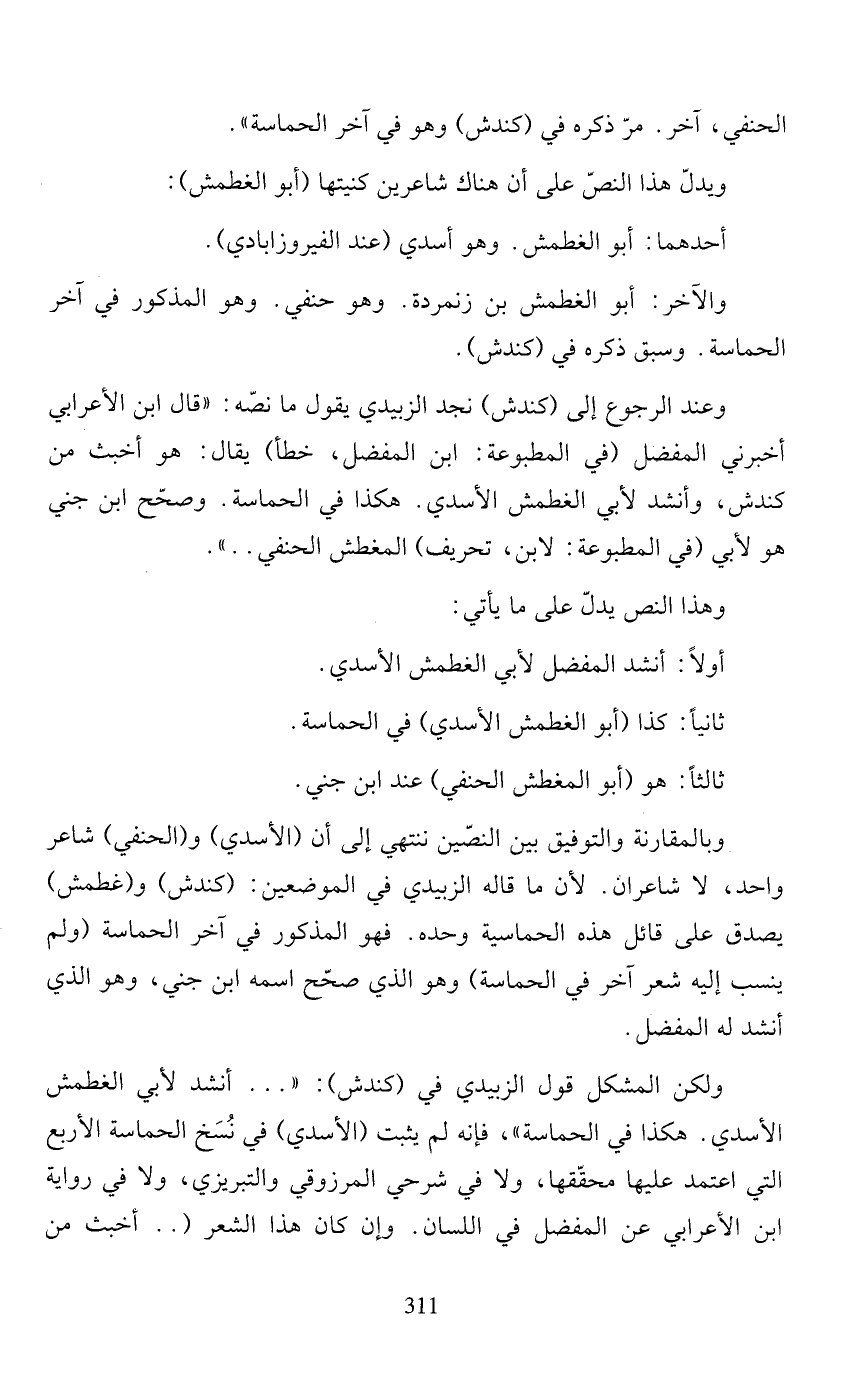 وعند الرجوع إلى (كندش) نجد الزبيدي يقول ما نصّه: "قال ابن الأعرابي أخبرني المفضل (في المطبوعة: ابن الفضل، خطأ) يقال: هو أخبث من كندش، وأنشد لأبي الغطمش الأسدي. هكذا في الحماسة. وصحّح ابن جني هو لأبي (في المطبوعة: لابن، تحريف) المغطش الحنفي ... ".