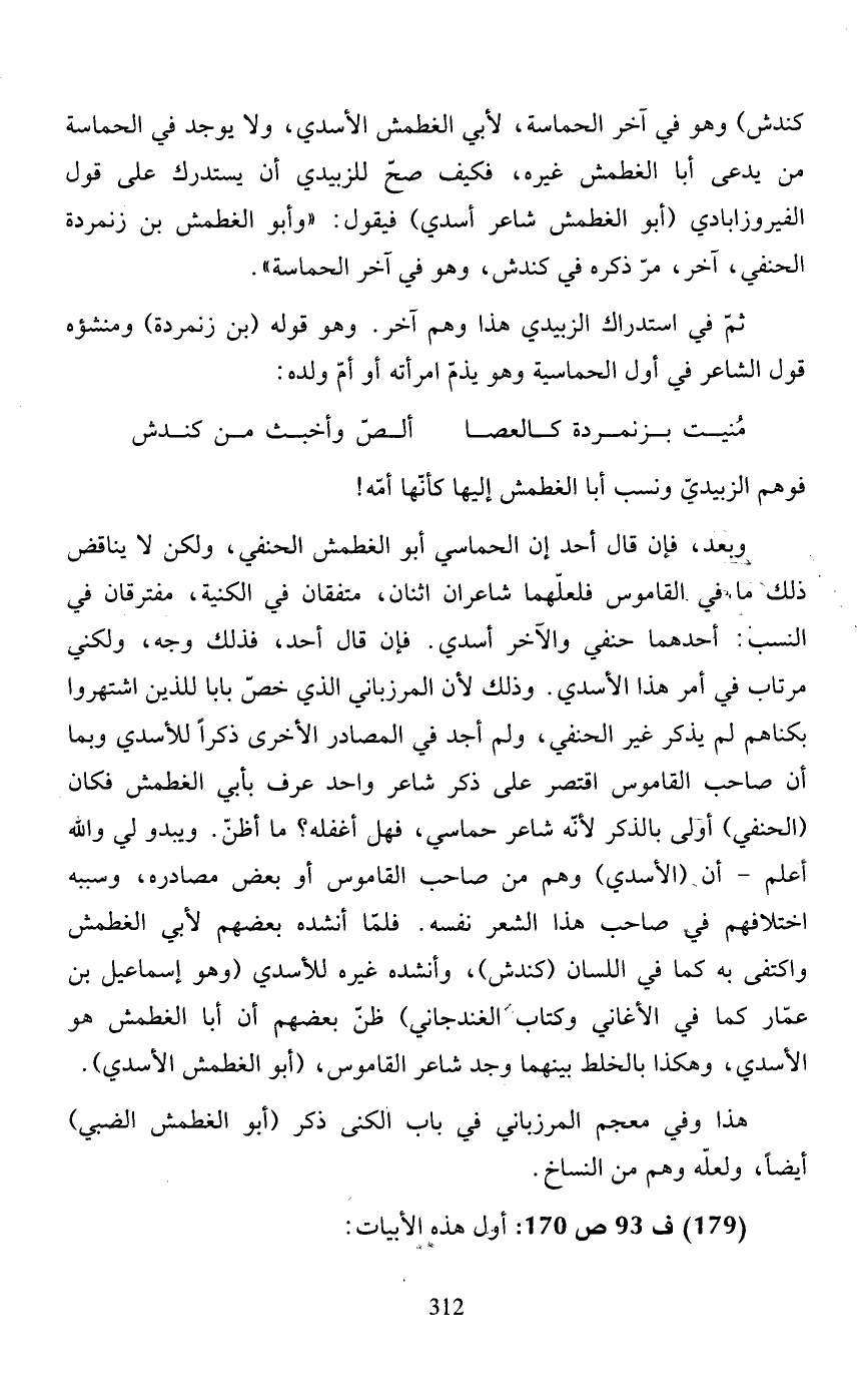 كندش) وهو في آخر الحماسة، لأبي الغطمش الأسدي، ولا يوجد في الحماسة من يدعى أبا الغطمش غيره، فكيف صحّ للزبيدي أن يستدرك على قول الفيروزابادي (أبو الغطمش شاعر أسدي) فيقول: "وأبو الغطمش بن زنمردة الحنفي، آخر، مرّ ذكره في كندش، وهو في آخر الحماسة".