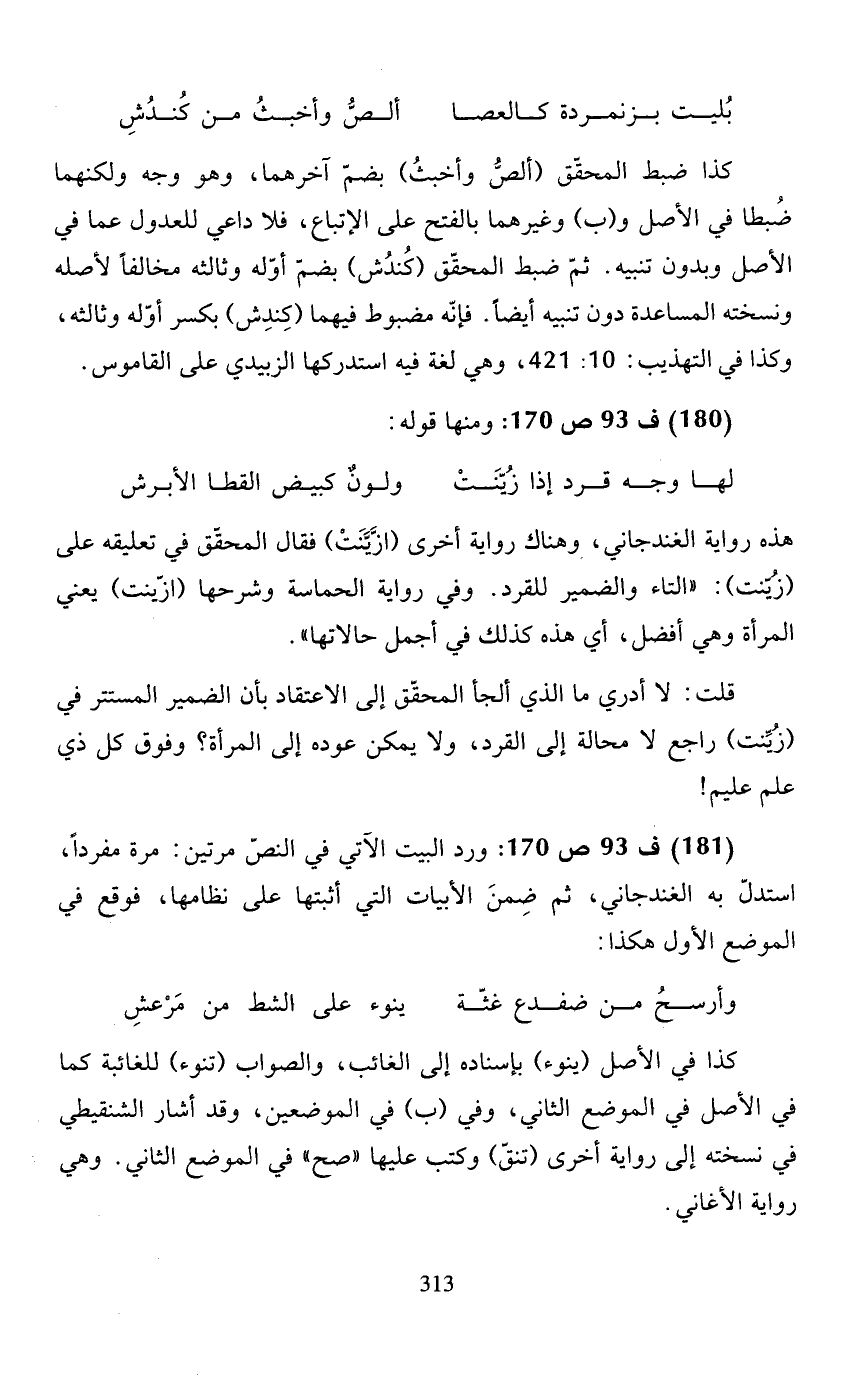 (181) ف 93 ص 170: ورد البيت الآتي في النصّ مرتين: مرة مفردًا، استدلّ به الغندجاني، ثم ضمن الأبيات التي أثبتها على نظامها، فوقع في الموضع الأول هكذا: