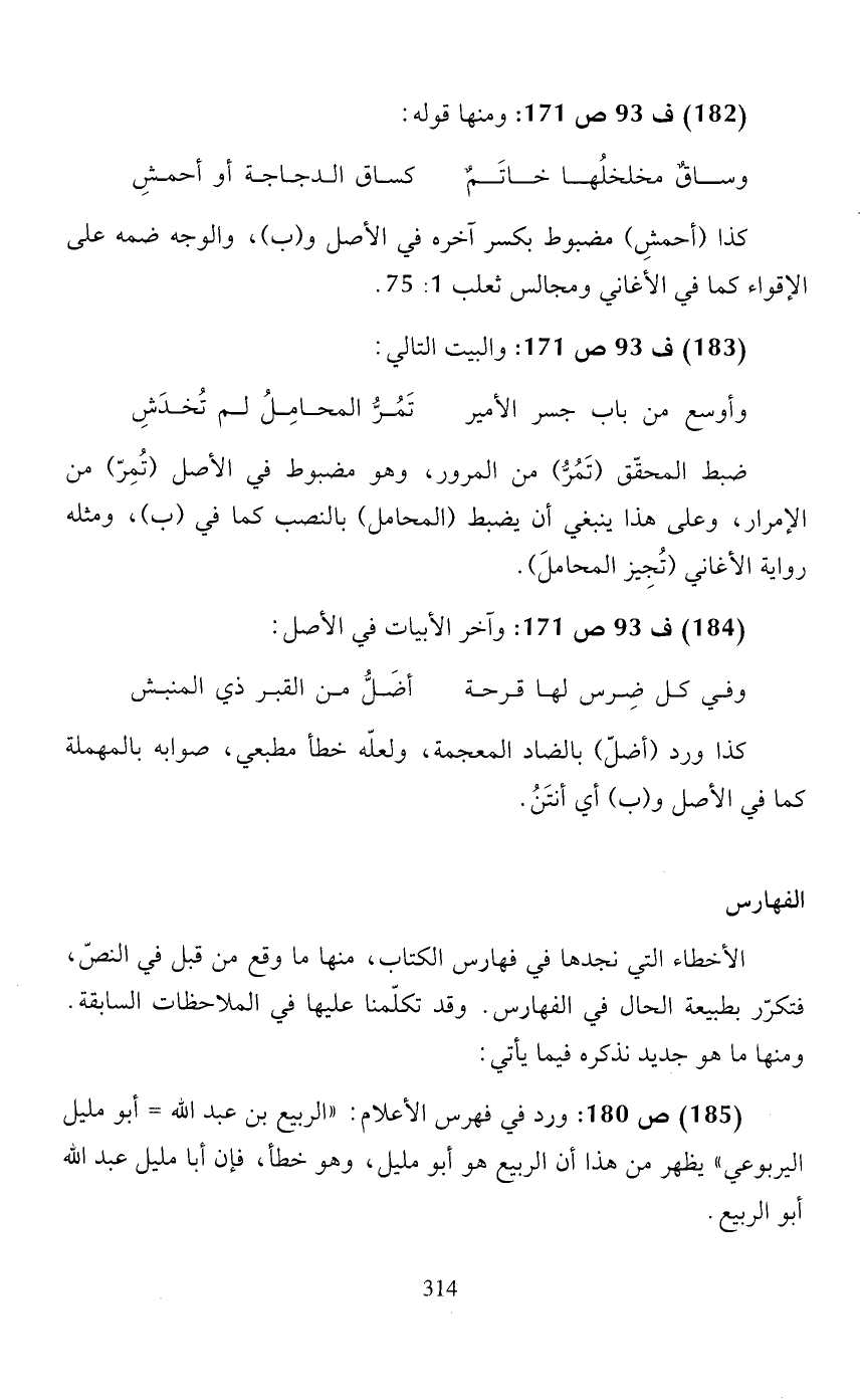 (185) ص 180: ورد في فهرس الأعلام: "الربيع بن عبد الله = أبو مليل اليربوعي" يظهر من هذا أن الربيع هو أبو مليل، وهو خطأ، فإن أبا مليل عبد الله أبو الربيع.