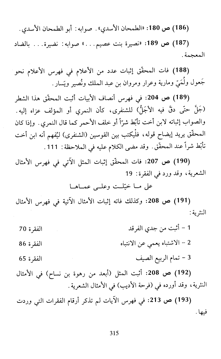 (186) ص 204: في فهرس أنصاف الأبيات أثبت المحقّق هذا الشطر (جلَّ حتّى دقَّ فيه الأجلَّ) للشنفرى، كأن النمري أو المؤلف عزاه إليه. والصواب إثباته لابن أخت تأبّط شرّاً أو خلف الأحمر كما قال النمري. وإذا كان المحقّق يريد إيضاح قوله، فليكتب بين القوسين (الشنفرى) ليفهم أنه ابن أخت تأبّط شرًا عند المحقّق. وقد مضى الكلام عليه في الملاحظة: 111.