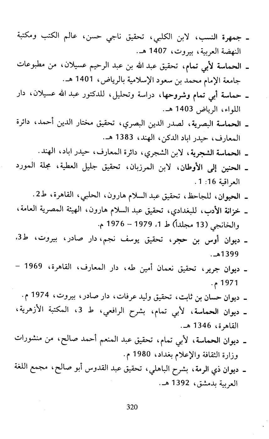 - ديوان الحماسة، لأبي تمام، تحقيق عبد المنعم أحمد صالح، من منشورات وزارة الثقافة والإعلام بعداد، 1980 م.
