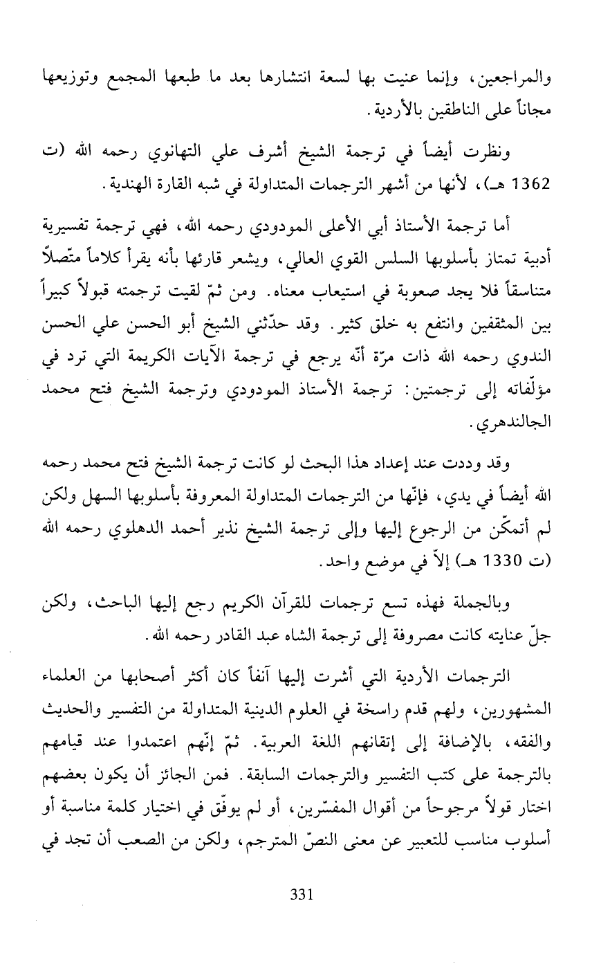 ونظرت أيضًا في ترجمة الشيخ أشرف علي التهانوي رحمه الله (ت 1362 هـ)، لأنها من أشهر الترجمات المتداولة في شبه القارة الهندية.