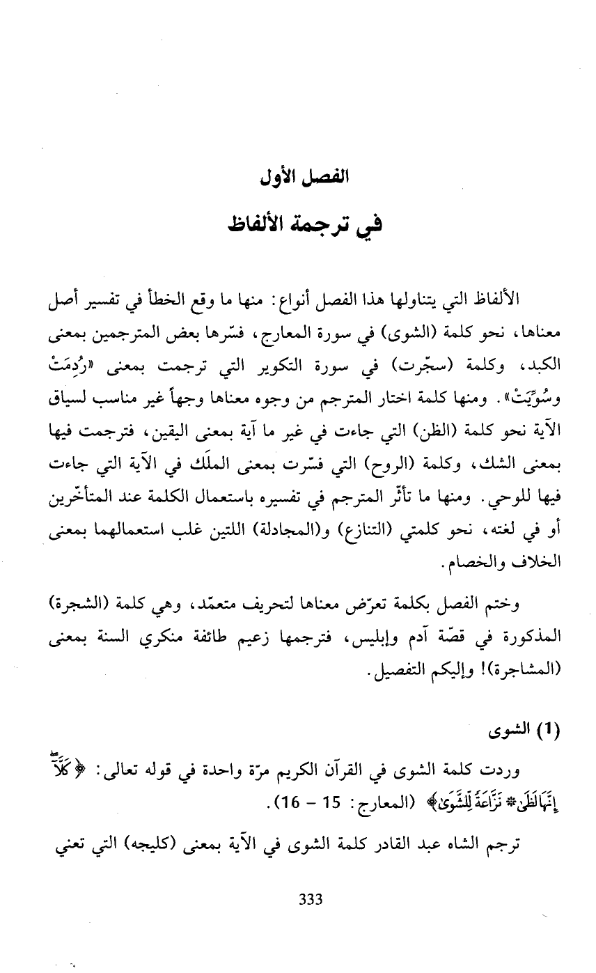 الألفاظ التي يتناولها هذا الفصل أنواع: منها ما وقع لخطأ في تفسير أصل معناها، نحو كلمة (الشوى) في سورة المعارج، فسّرها بعض المتردجمين بمعنى الكبد، وكلمة (سجّرت) في سورة التكوير التي ترجمت بمعنى "ردمت وسوِّيت". ومنها كلمة اختار المترجم من وجوه معناها وجهًا غير مناسب لسياق الآية نحو كلمة (الظن) التي جاءت في غير ما لآية بمعنى اليقين، فترجمت فيها بمعنى الشك، وكلمة (الروح) التي فسّرت بمعنى الملك في الآية التي جاءت فيها للحي. ومنها ما تأثّر المترجم في تفسيره باستعمال الكلمة عند المتأخّرين أو في لغته، نحو كلمتي (التنازع) و (المجادلة) اللتين غلب استعمالهما بمعنى الخلاف والخصام.