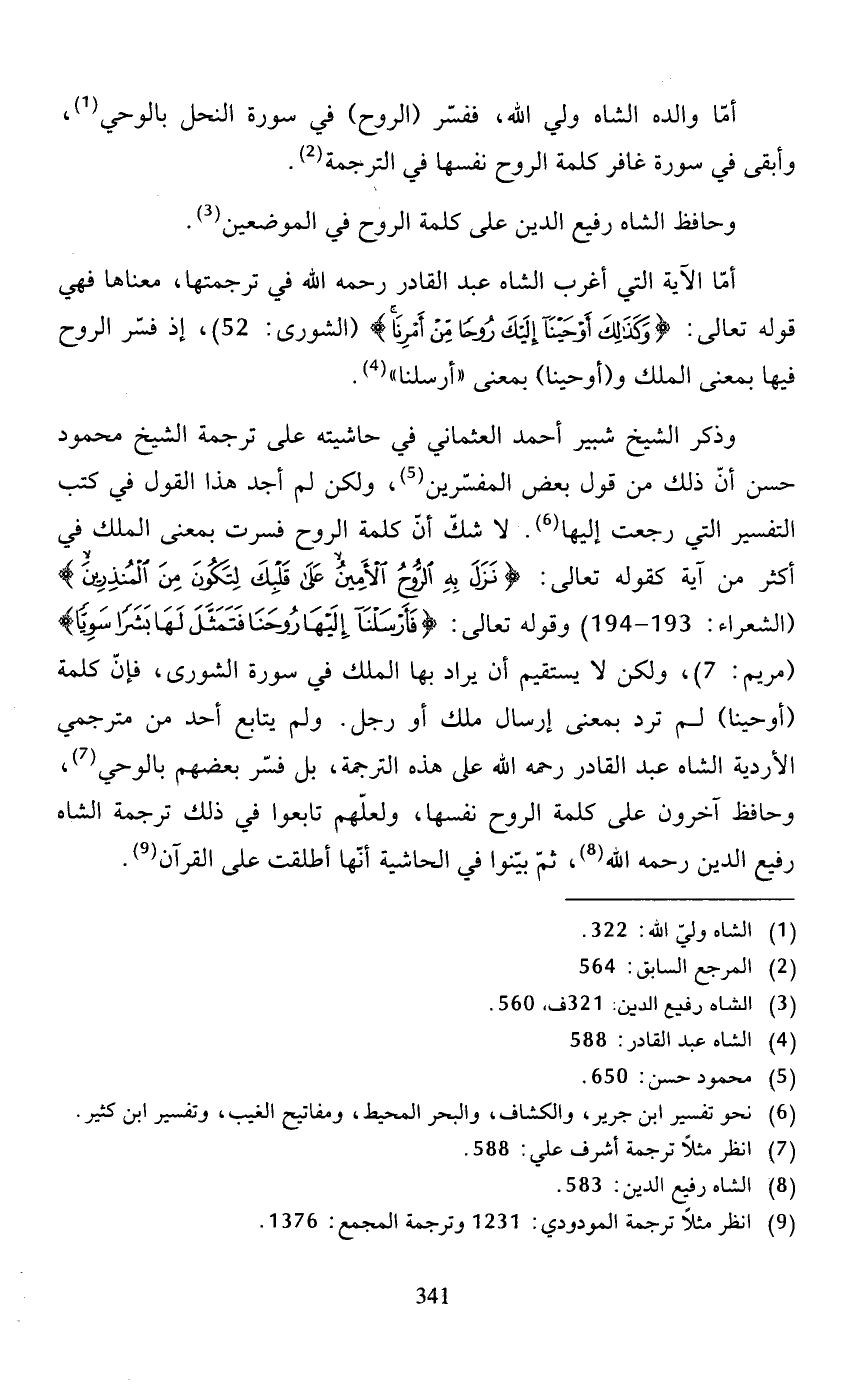 وذكر الشيخ شبير أحمد العثماني في حاشيته على ترجمة الشيخ محمود حسن أنّ ذلك من قول بعض المفسّرين (5)، ولكن لم أجد هذا القول في كتب التفسير التي رجعت إليها (6). لا شكّ أنّ كلمة الروح فسرت بمعنى الملك في أكثر من آية كقوله تعالى: {نزل به الرُّوح الأمين على قلبك لتكون من المنذرين} (الشعراء: 193 - 194) وقوله تعالى: {فأرسلنا إليها روحنا فتمثّل لها بشراً سوياً} (مريم: 7)، ولكن لا يستقيم أن يراد بها الملك في سورة الشورى، فإنّ كلمة (أوحينا) لم ترد بمعنى إرسال ملك أو رجل. ولم يتابع أحد من مترجمي الأردية الشاه عبد القادر رحمه الله على هذه الترجمة، بل فسّر بعضهم بالوحي (7)، وحافظ آخرون على كلمة الروح نفسها، ولعلّهم تابعوا في ذلك ترجمة الشاه رفيع الدين رحمه الله (8)، ثمّ بيّنوا في الحاشية أنّها أطلقت على القرآن (9).