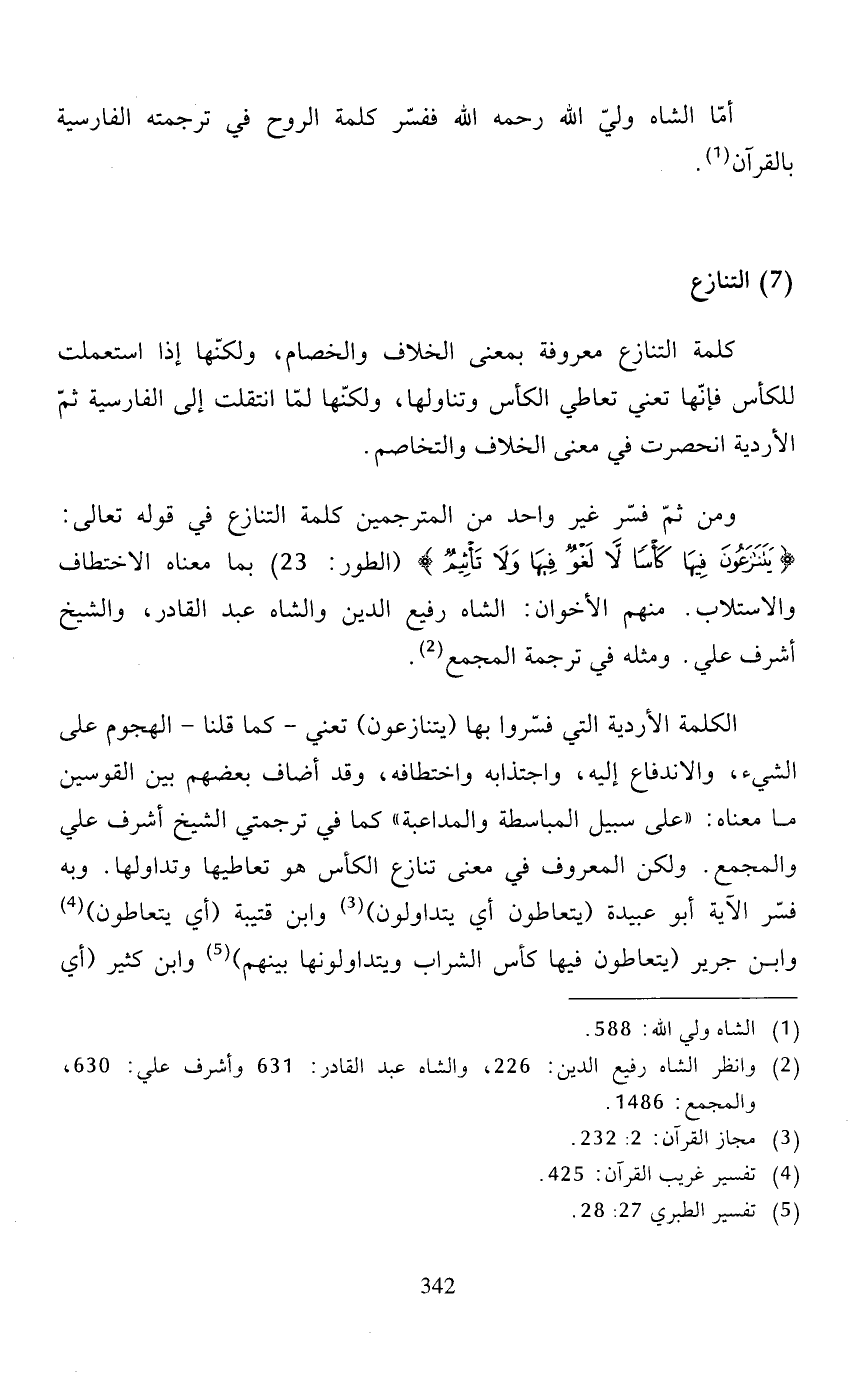 الكلمة الأردية التي فسّروا بها (يتنازعون) تعني -كما قلنا- الهجوم على الشيء، والاندفاع إليه، واجتذابه واختطافه، وقد أضاف بعضهم بين القوسين ما معناه: "على سبيل المباسطة والمداعبة" كما في ترجمتي الشيخ أشرف علي والمجمع. ولكن المعروف في معنى تنازع الكأس هو تعاطيها وتداوليها. وبه فسّر الآية أبو عبيدة (يتعاطون أي يتداولون) (3) وابن قتيبة (أي يتعاطون) (4) وابن جرير (يتعاطون فيها كأس الشراب ويتداولونها بينهم) (5) وابن كثير (أي
