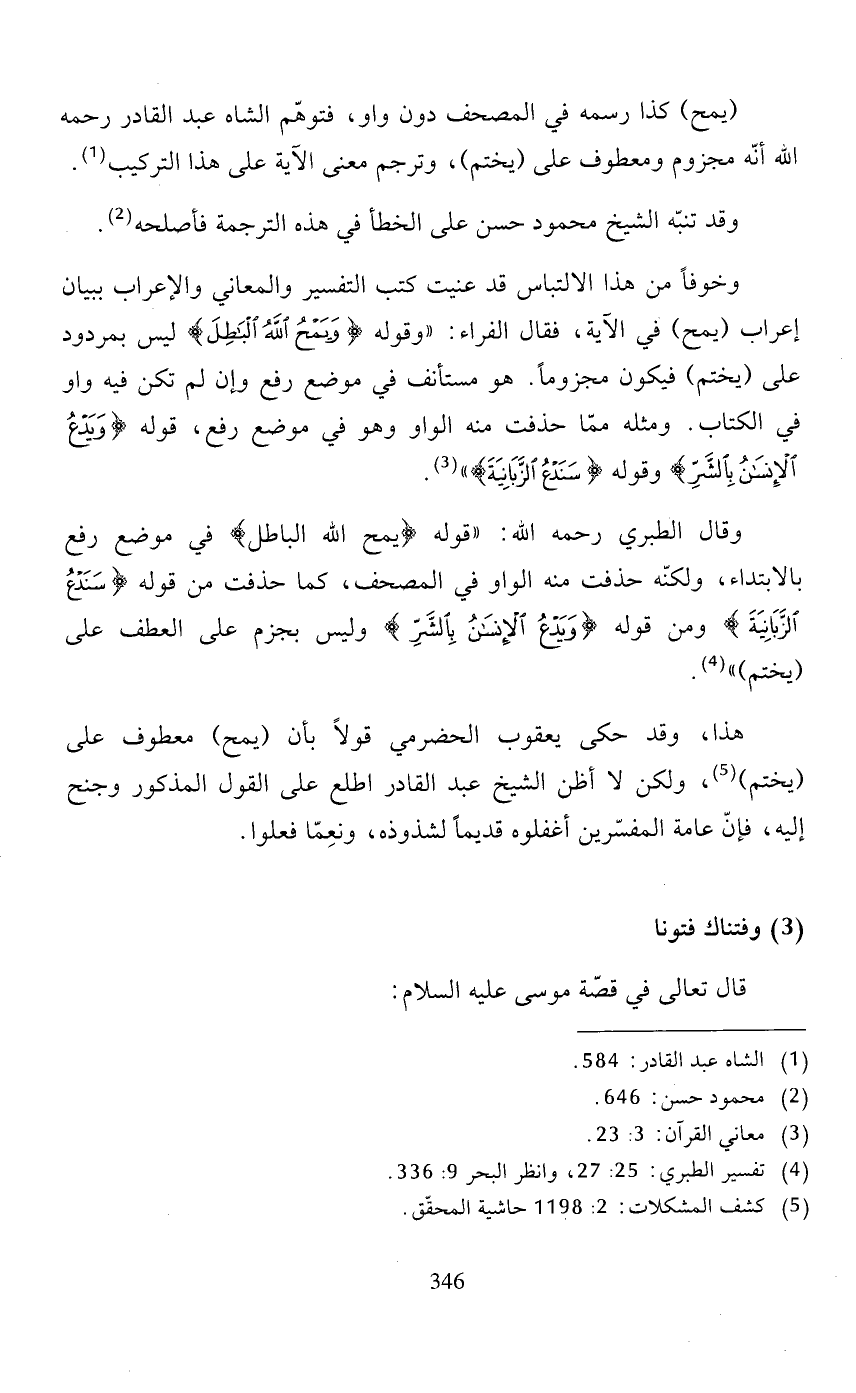 هذا، وقد حكى يعقوب الحضرمي قولًا بأن (يمح) معطوف على (يختم) (5)، ولكن لا أظن الشيخ عبد القادر اطلع على القول المذكور وجنح إليه، فإنّ عامة المفسّرين أغفلوه قديمًا لشذوذه، ونعمّا فعلوا.