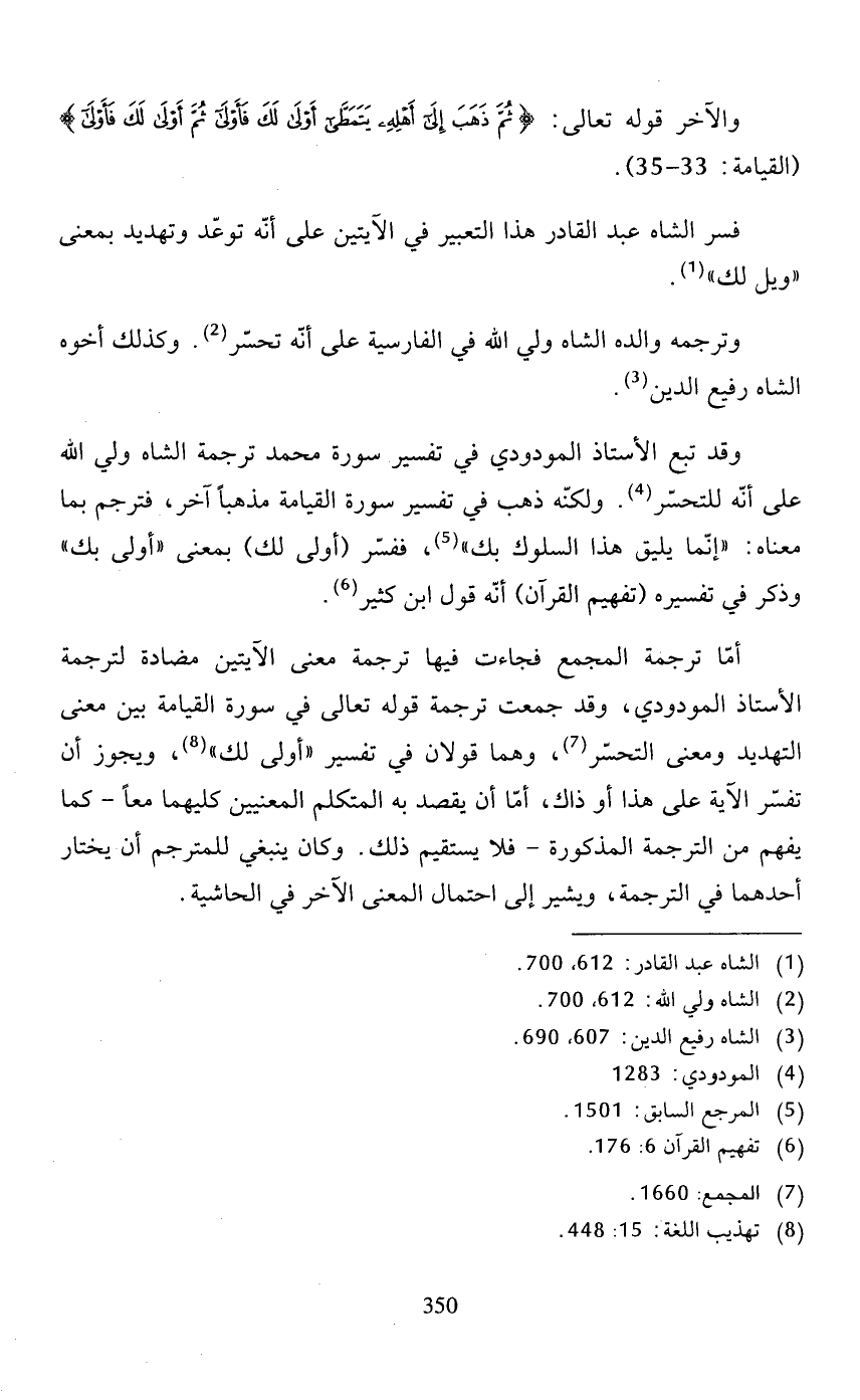 أمّا ترجمة المجمع فجاءت فيها ترجمة معنى الآيتين مضادة لترجمة الأستاذ المودودي، وقد جمعت ترجمة قوله تعالى في سورة القيامة بين معنى التهديد ومعنى التحسّر (7)، وهما قولان في تفسير "أولى لك" (8)، ويجوز أن تفسّر الآية على هذا أو ذاك، أمّا يستقيم ذلك. وكان ينبغي للمترجم أن يختار أحدهما في الترجمة، ويشير إلى احتمال المعنى الآخر في الحاشية.