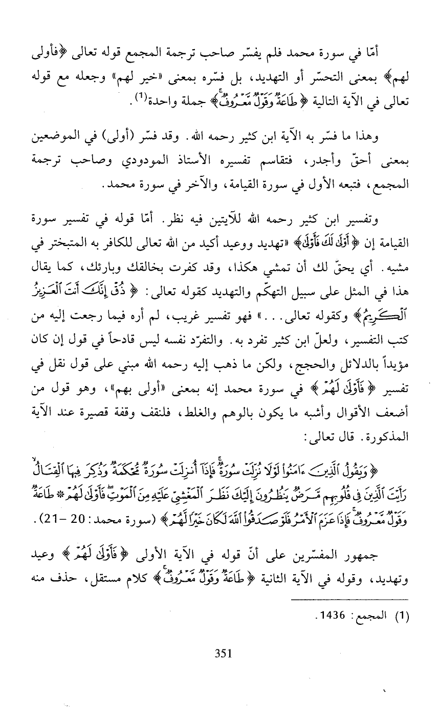 وكقوله تعالى. . ." فهو تفسير غريب، لم أره فيما رجعت إليه من كتب التفسير، ولعلّ ابن كثير تفرد به. والتفرّد نفسه ليس قادحاً في قول إن كان مؤيدًا بالدلائل والحجج، ولكن ما ذهب إليه رحمه الله مبني على قول نقل في تفسير {فَأَوْلَى لَهُمْ} في سورة محمد إنه بمعنى"أولى بهم"، وهو قول من أضعف الأقوال