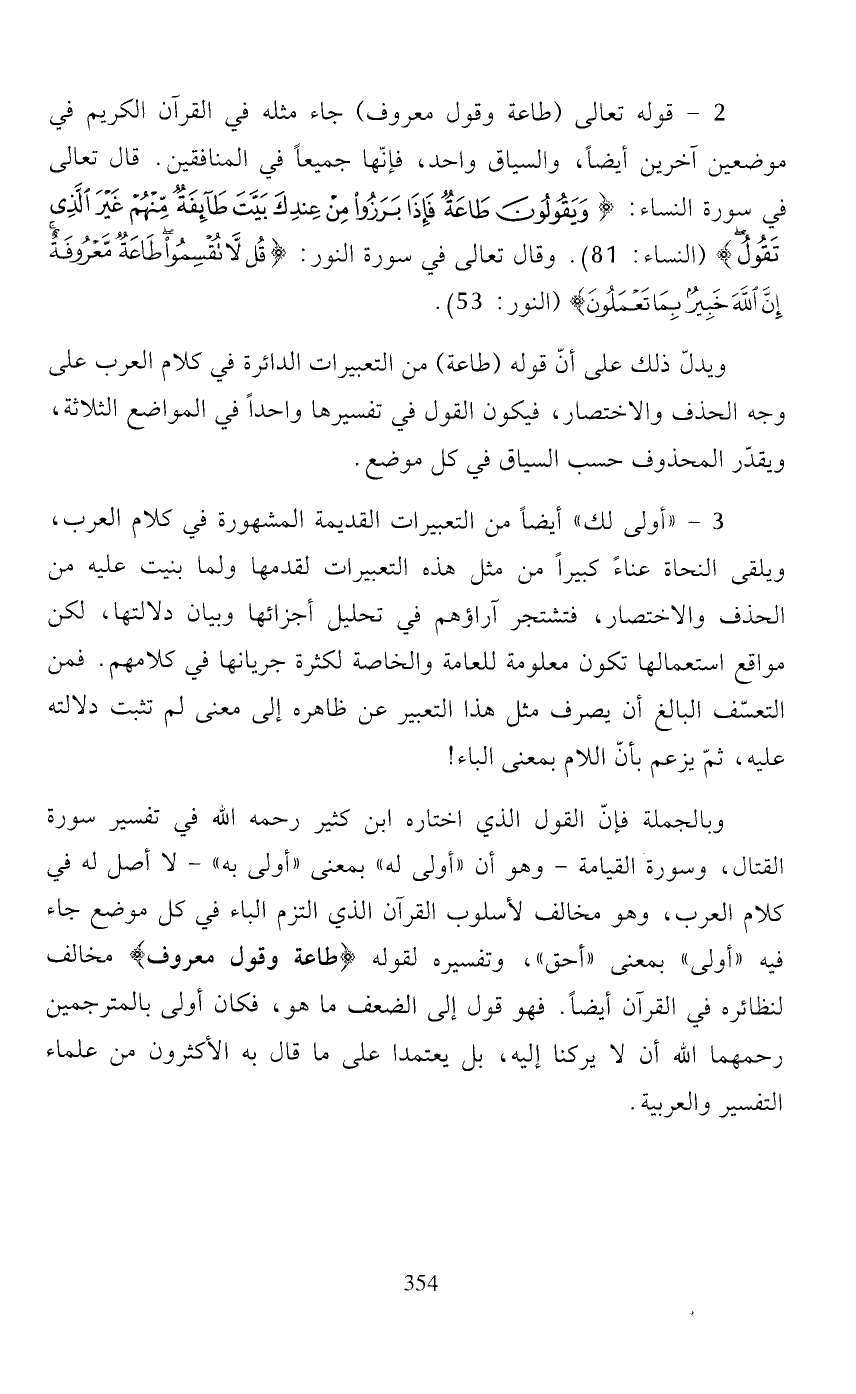 وبالجملة فإنّ القول الذي اختاره ابن كثير رحمه الله في تفسير سورة القتال، وسورة القيامة - وهو أن"أولى له" بمعنى "أولى به" - لا أصل له في كلام العرب، وهو مخالف لأسلوب القرآن الذي التزم الباء في كل موضع جاء فيه"أولى" بمعنى"أحق"، وتفسيره لقوله {طاعة وقول معروف} مخالف لنظائره في القرآن أيضًا. فهو قول إلي الضعف ما هو، فكان أولى بالمترجمين رحمهما الله أن لا يركنا إليه، بل يعتمدا على ما قال به الأكثرون من علماء التفسير والعربية.
