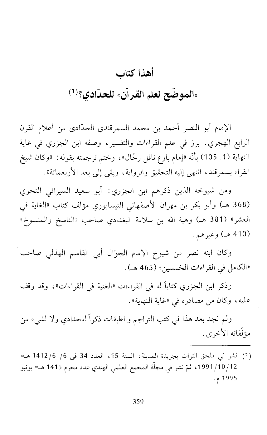 (1) نشر فى ملحق التراث بجريدة المدينة، السنة 15، العدد في 6/ 6/ 1412 هـ = 12/ 10/1991، ثمّ نشر في مجلّة المجمع العلمي الهندي عدد محرم 1415 هـ = يونيو 1995 م.