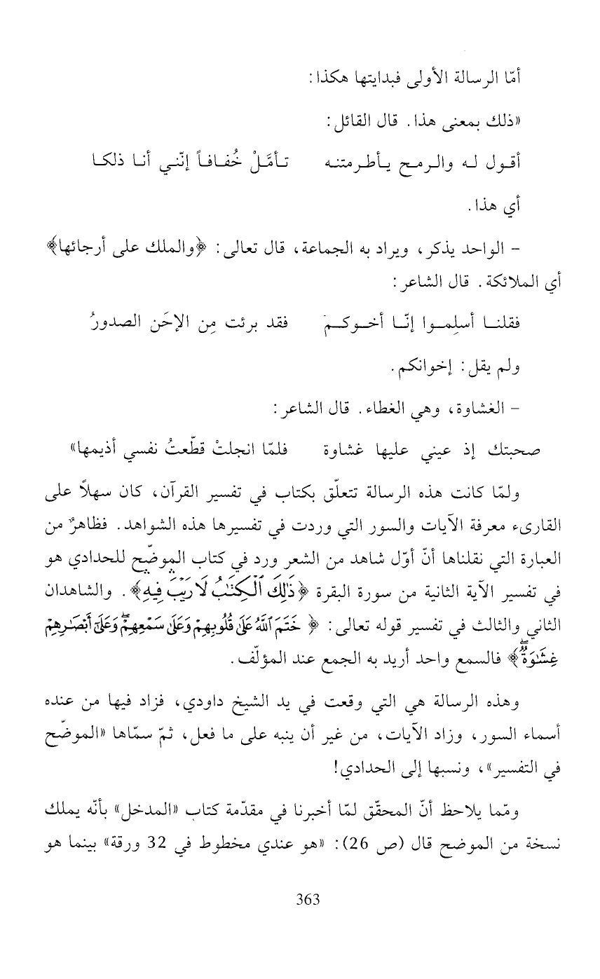 وهذه الرسالة هي التي وقعت في الشيخ داودي، فزاد فيها من عنده أسماء السور، وزاد الآيات، من غير أن ينبه على ما فعل، ثمّ سمّاها"الموضّح في التفسير"، ونسبها إلي الحدادي!