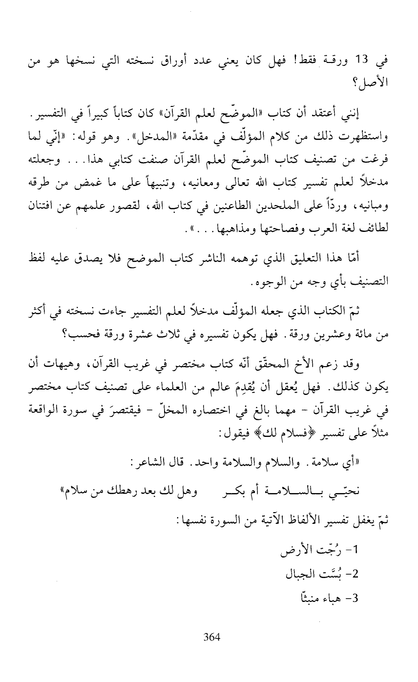 وقد زعم الأخ المحقّق أنّه كتاب مختصر في غريب القرآن، وهيهات أن يكون كذلك. فهل يعقل أن يقدم عالم من العلماء على تصنيف كتاب مختصر في غريب القرآن - مهما بالغ في اختصاره المخلّ - فيقتصر في سورة الواقعة مثلاً على تفسير {فسلام لك} فيقول: