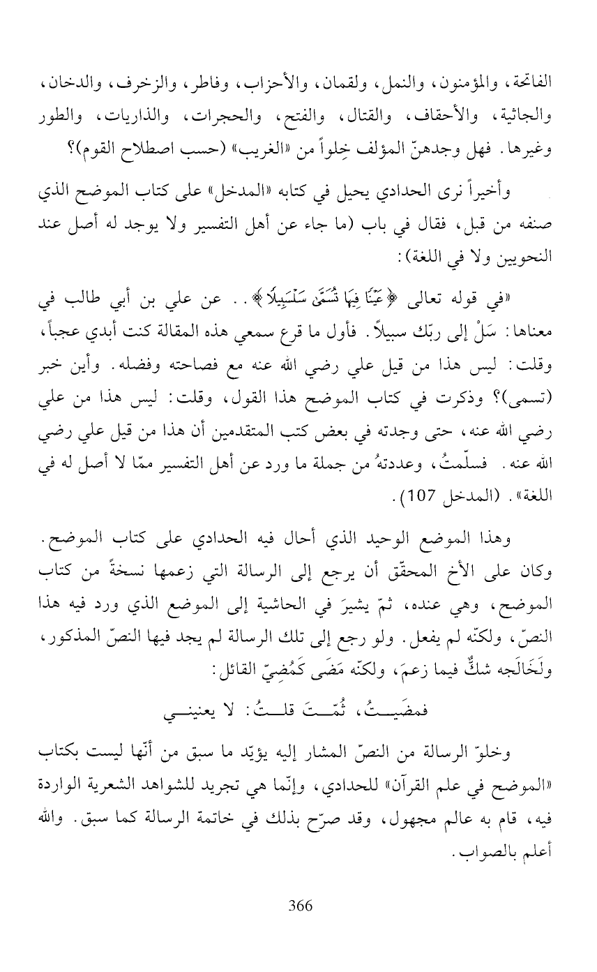 وكان على الأخ المحقّق أن يرجع إلي الرسالة التي زعمها نسخةً من كتاب الموضح، وهي عنده، ثمّ يشير في الحاشية إلي الموضع الذي ورد فيه هذا النصّ، ولكنّه لم يفعل. ولو رجع إلي تلك الرسالة لم يجد فيها النصّ المذكور، ولخالجه شكٌ فيما زعم، ولكنّه مضى كمضيّ القائل: