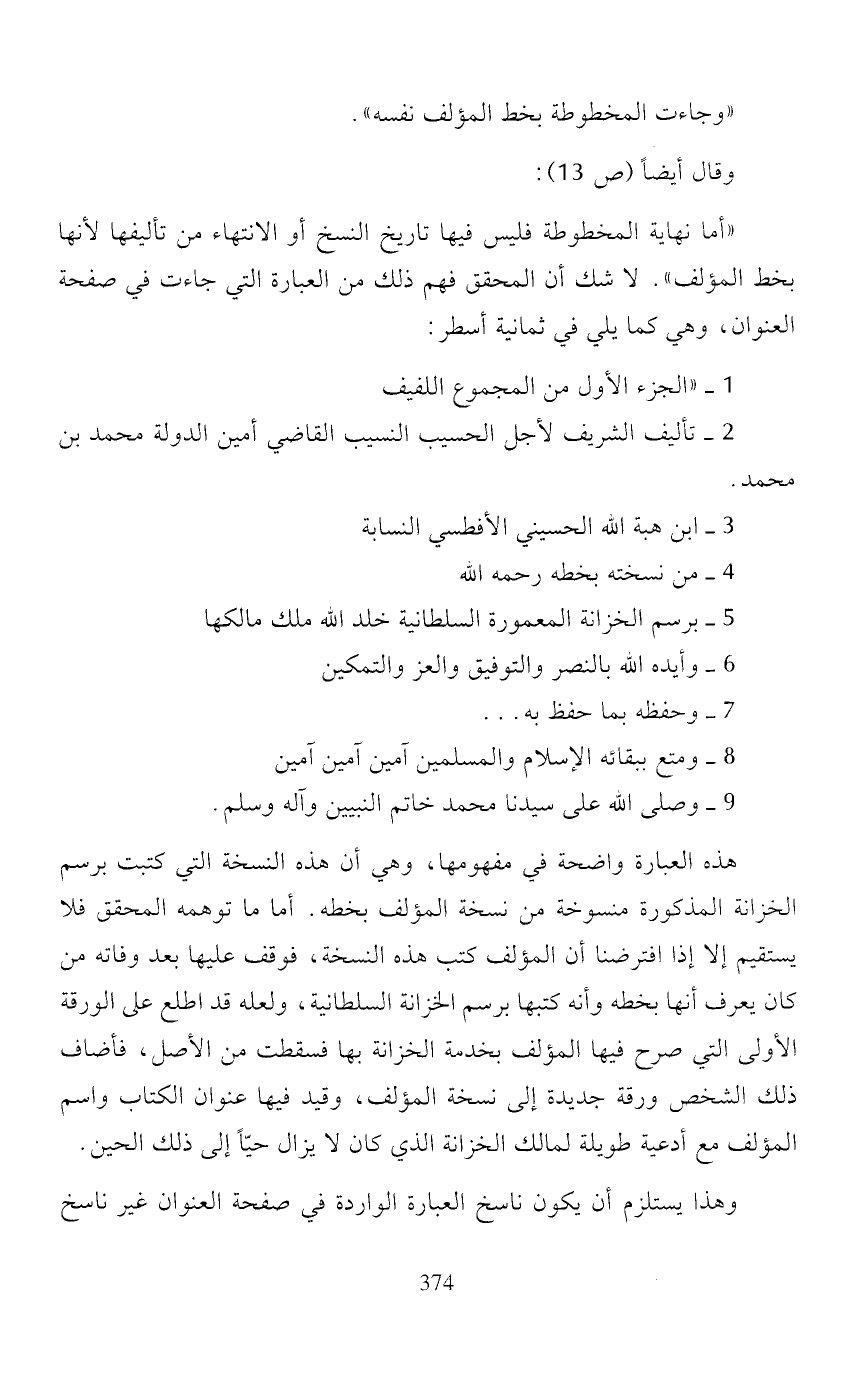 هذه العبارة واضحة في مفهومها، وهي أن هذه النسخة التي كتبت برسم الخزانة المذكورة منسوخة من نسخة المؤلف بخطه. أما ما توهمه المحقق فلا يستقيم إلا إذا افترضنا أن المؤلف كتب هذه النسخة، فوقف عليها بعد وفاته من كان يعرف أنها بخطه وأنه كتبها برسم الخزانة السلطانية، ولعله قد اطلع على الورقة الأولى التي صرح فيها المؤلف بخدمة الخزانة بها فسقطت من الأصل، فأضاف ذلك الشخص ورقة جديدة إلى نسخة المؤلف، وقيد فيها عنوان الكتاب اسم المؤلف مع أدعية طويلة لمالك الخزانة الذي كان لا يزال حيّاً إلى ذلك الحين.