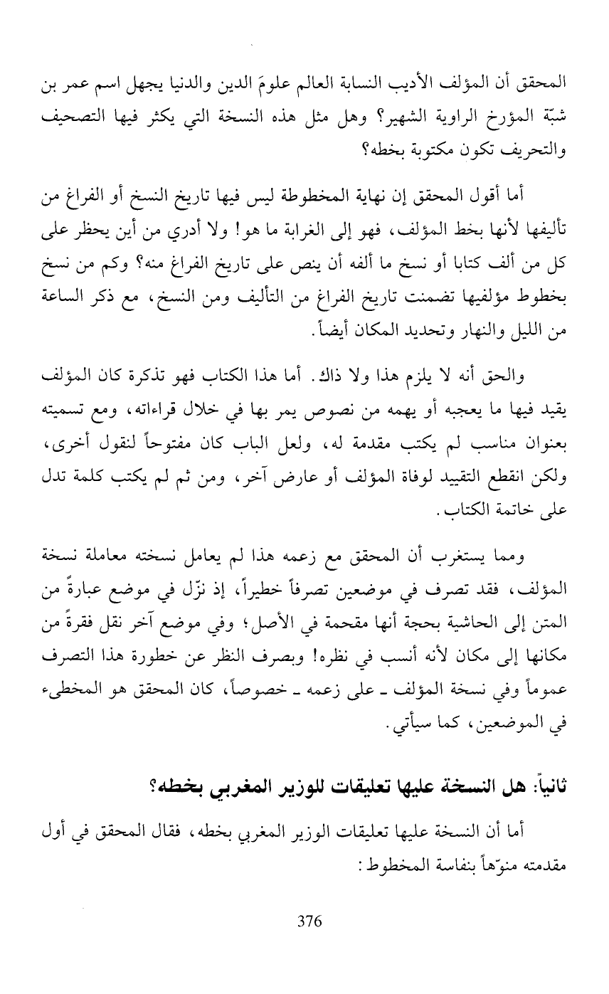 المحقق أن المؤلف الأديب النسابة العالم علوم الدين والدنيا يجهل اسم عمر بن شبّه المؤرخ الرواية الشهير؟ وهل مثل هذه النسخة التي يكثر فيها التصحيف والتحريف تكون مكتوبة بخطه؟