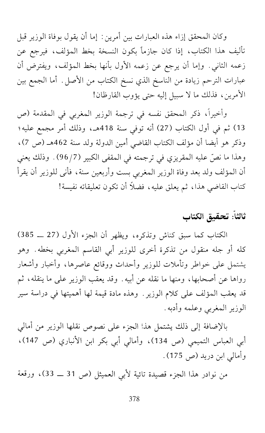 وكان المحقق إزاء هذه العبارات بين أمرين: إما أن يقول بوفاة الوزير قبل تأليف هذا الكتاب، إذا كان جازماً بكون النسخة بخط المؤلف، فيرجع عن زعمه الثاني. وإما أن يرجع عن زعمه الأول بأنها بخط المؤلف، ويفترض أن عبارات الترحم بزيادة من الناسخ الذي نسخ الكتاب من الأصل. أما الجمع بين الأمرين، فذلك ما لا سبيل إليه حتى يؤوب القارظان!
