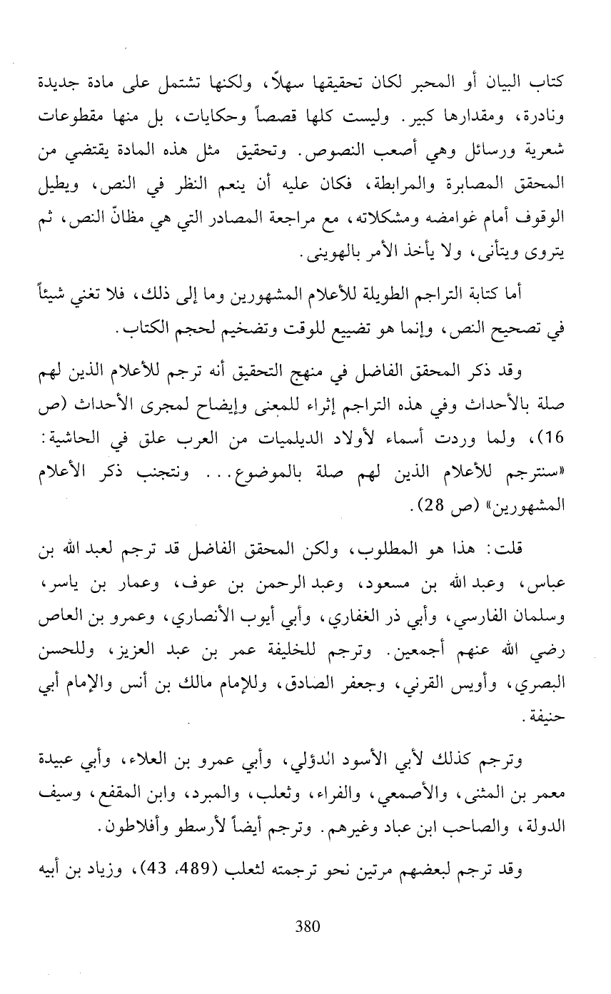 أما كتابة التراجم الطويلة للأعلام المشهورين وما إلى ذلك، فلا تغني شيئاً في تصحيح النص، وإنما هو تضييع للوقت وتضخيم لحجم الكتاب.