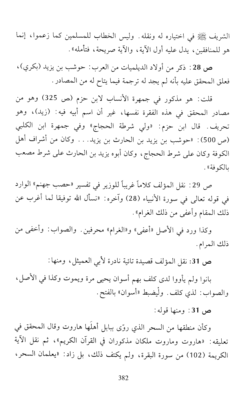 ص 29: نقل المؤلف كلامًا غريبًا للوزير في تفسير "حصب جهنم" الوارد في قوله تعالى في سورة الأنبياء (28) وآخره: "نسأل الله توفيقا لما أغرب عن ذلك المقام وأعفى من ذلك الغرام".