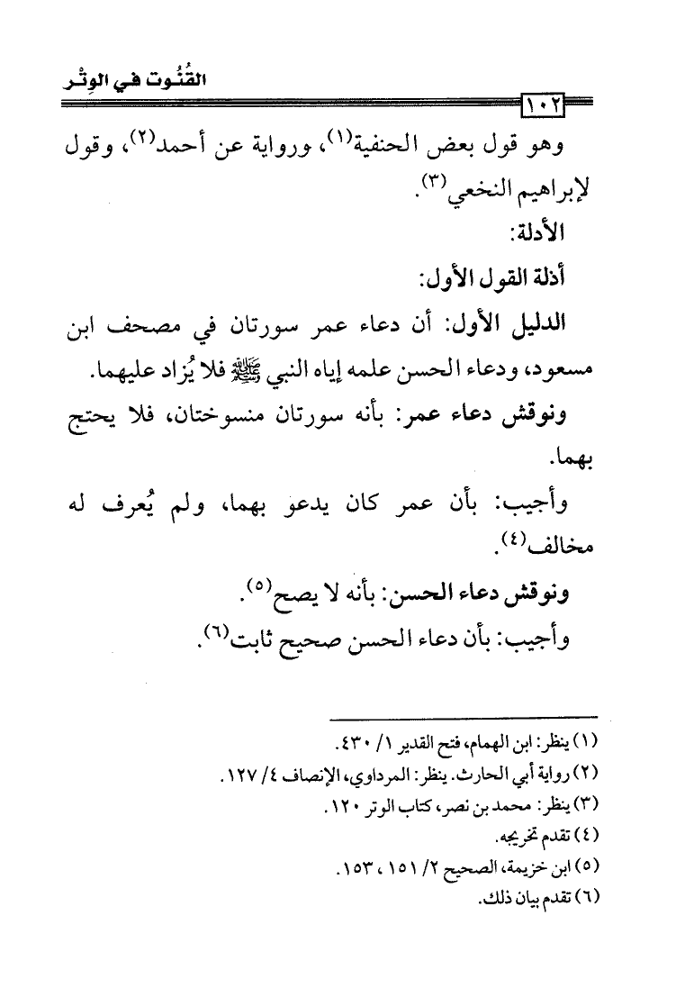الدليل الأول: أن دعاء عمر سورتان في مصحف ابن مسعود، ودعاء الحسن علمه إياه النبي - صلى الله عليه وسلم - فلا يُزاد عليهما.