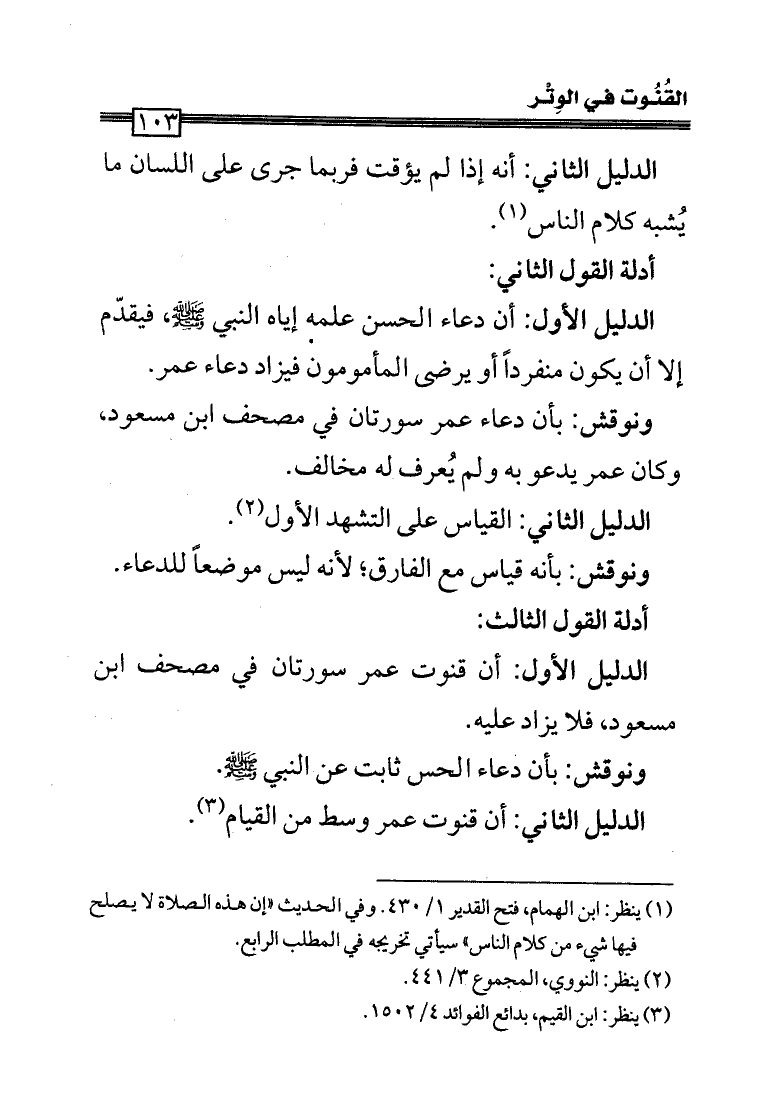 الدليل الأول: أن قنوت عمر سورتان في مصحف ابن مسعود، فلا يزاد عليه.