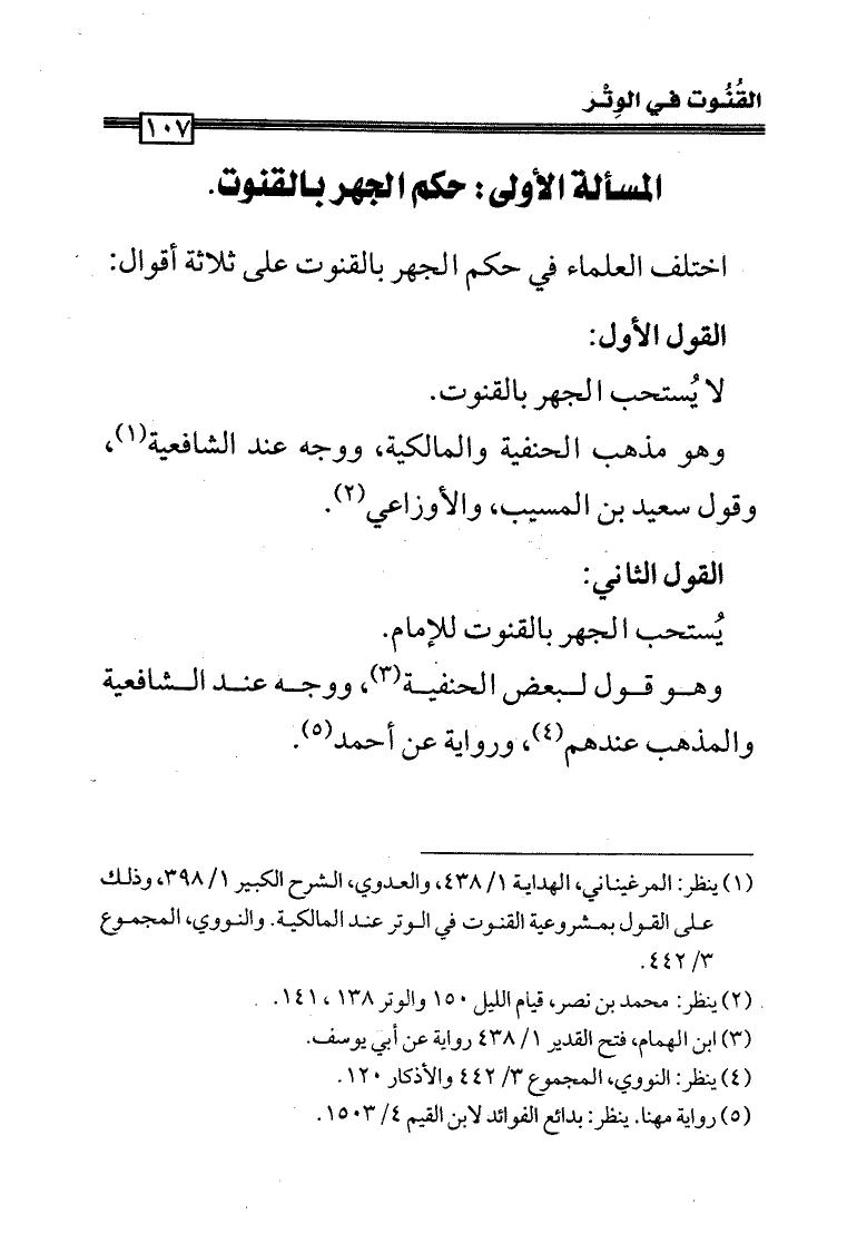 (¬1) ينظر: المرغيناني، الهداية (1/ 438)، والعدوي، الشرح الكبير (1/ 398)، وذلك على القول بمشروعية القنوت في الوتر عند المالكية. والنووي، المجموع (3/ 442).