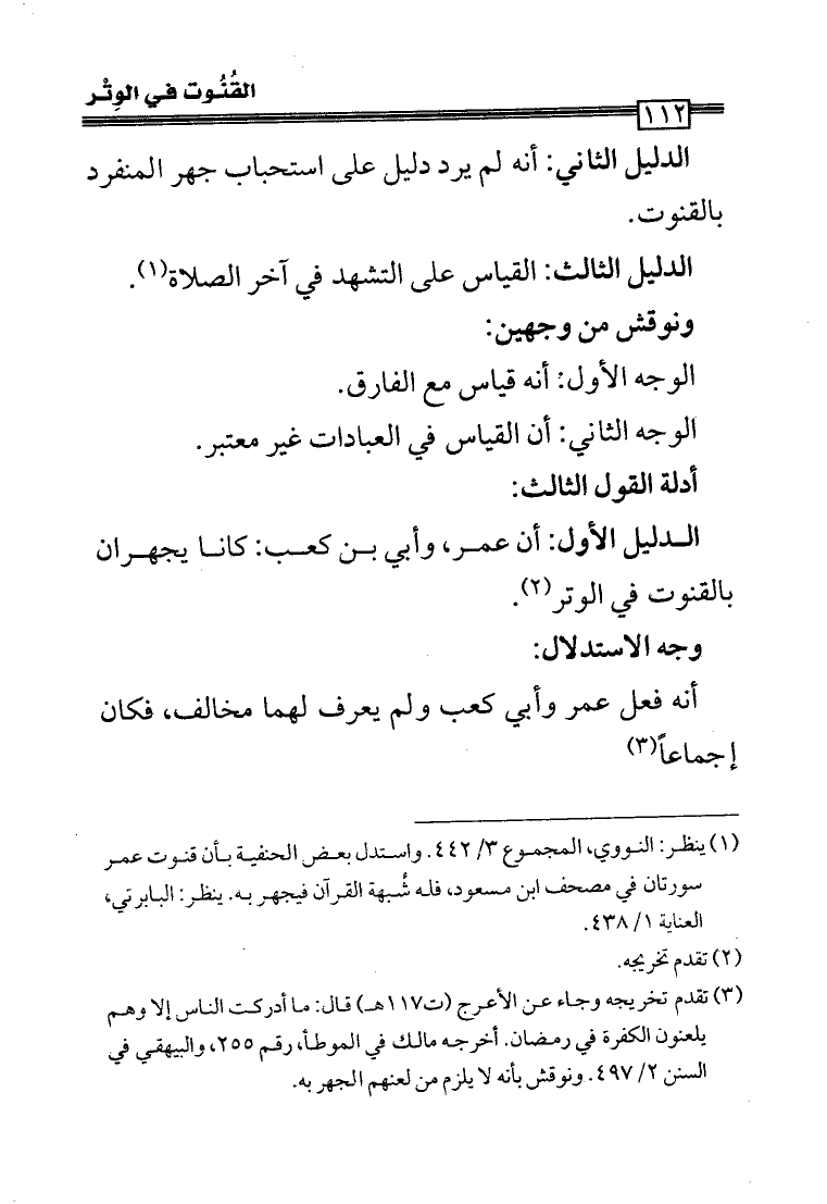 (¬1) ينظر: النووي، المجموع (3/ 442). واستدل بعض الحنفية بأن قنوت عمر سورتان في مصحف ابن مسعود، فله شُبهة القرآن فيجهر به. ينظر: البابرتي، العناية (1/ 438).